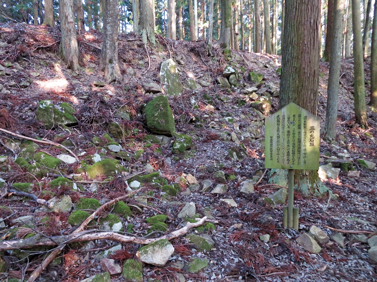 日本100名城に指定される吉田郡山城。城の南西には毛利家の墓所があり、毛利家が本拠としていたことをうかがい知ることができます。今回は南西側から登りましたが、このルートはしばらく尾根に沿ってこのようななだらかな道が続き、城の主要部に近づくと、坂が険しくなります。本丸付近は階段状の縄張りになっており、三の丸の側面などには崩落した石垣が残っています。この場所も現存して入れはそれなりの高さの石垣であったのだろうかと当時をしのばせます。本丸付近は現在は林になっているため眺望はありませんが、曲輪がわかりやすく遺構として残っている名城です。