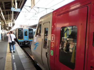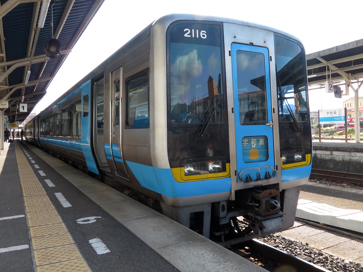 松山~宇和島を結ぶ特急宇和海。今回は高知からの帰路に、河後森城跡を訪れて予土線で宇和島入りして、宇和島16:03発 宇和海22号1072Dを利用しました。列車はグリーン車込みの2000系3両でした。2000系には一部に座席等内容のリニューアルが行われた車両もありますが、この車両はまだリニューアルされていない車両でした。予讃線・内子線を経由して結び、所々で海を見ながら快走するので、松山まではあっという間に到着する印象でした。卯之町や八幡浜、伊予大洲など観光地や港などが付近にある駅にも停車することから、途中駅からの利用にも便利な印象です。また、多くの列車が松山駅では岡山・高松行の特急しおかぜ・いしづちとも接続が図られており、同じホームで短時間で乗り換えができ、非常に便利でした。
