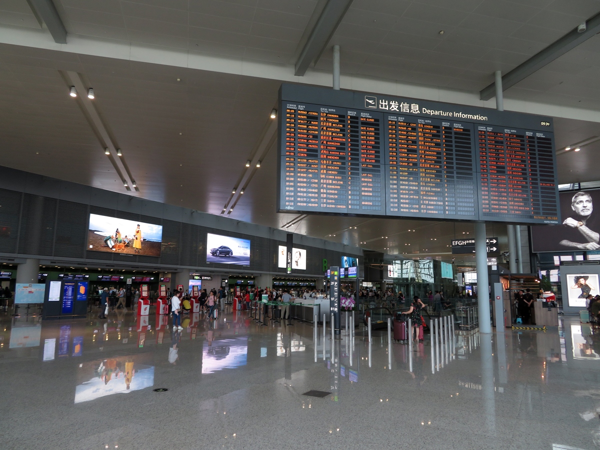 国際線が中心の浦東空港に対し、国内線が中心となる虹橋空港。近年高速鉄道などが発着する上海虹橋駅が近くに完成し、高速鉄道との乗り換えも非常に便利になりました。羽田線など国際線は第一ターミナル、国内線は第二ターミナルからの出発となります。今回は中国国際航空にて北京へ移動するために利用しました。チェックインカウンターがあるエリアに入る前には鉄道駅などと同様に手荷物検査などがあります。今回チェックイン時には、カウンターで預けた荷物がX線で引っかかるという事象があり、カウンター裏手にある部屋で変圧器であることの確認を受けました。その他は問題なく手続きが完了しました。ターミナルは国内線にしてはさすがは広大で、多くの飲食店、土産物販売店、ファストフード店などが入っています。搭乗便は2時間近くの遅れでしたが、特に時間を持てあますことなく過ごすことが出来ました。