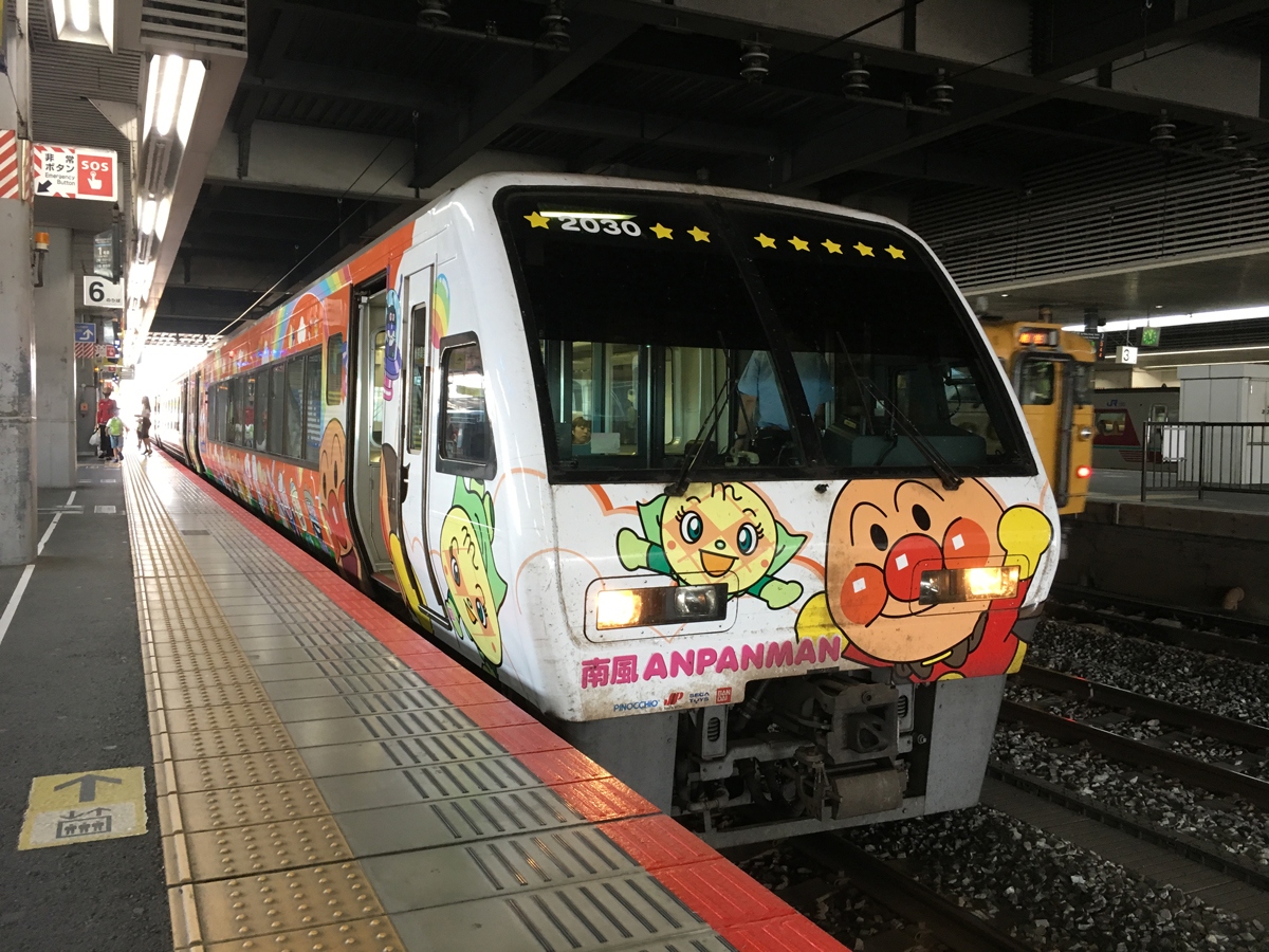 岡山から高知までを結ぶ特急南風。そのうちの何往復かはアンパンマンラッピングの車両で運行されます。今回は高知での所用の時刻に合わせて、岡山11:05発 南風7号を利用したため、アンパンマンラッピングの車両でした。利用時は2000系気動車でしたが、近年一部列車が更新され、2700系へと変更となりました。2700系でもアンパンマンラッピング車両が導入されています。2000系気動車の車端部の座席は、壁が近く少し窮屈に感じる座席でした。高知まで2時間半ほどですが、快走といった走りごたえのある走りで、快適に到着できました。新幹線を利用した場合は乗り継ぎ割引も適用されお得です。