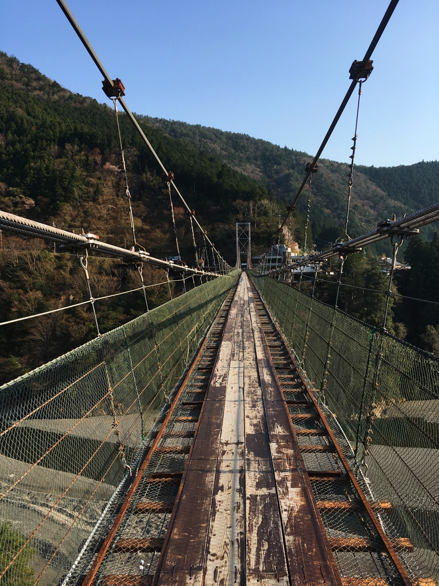 北方領土を除くと日本一の面積を誇る十津川村の中でも有数の観光名所がこの谷瀬の吊り橋です。前回は奈良・八木からの八木~新宮線、通称新宮特急での訪問となり、昼前後の到着であることから多くの方でにぎわっていましたが、今回は午後夕方近くの訪問であったことから、ほとんど人が居らずのんびり渡ることが出来ました。やはり橋の上から見る風景は格別で、空いているとゆっくりと見ることができます。橋を渡る手前、渡った先にもお土産物店があり、十津川周辺の名産品を買うことができます。駐車場は橋のたもと付近に、広大な有料駐車場がありました。