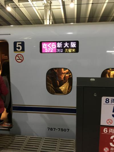 山陽新幹線から九州新幹線へ直通するさくら。九州新幹線内は熊本19:26発、新大阪行さくら572号S7編成を利用しました。さくら号は九州新幹線内では、ひかりの位置づけで、最速達のみずほ、各駅停車のつばめの間にあたる停車駅数です。利用列車は熊本以降、久留米・新鳥栖と停まり博多から山陽新幹線に入ります。主要駅に停車するため、途中駅からの利用も便利です。何よりみずほ・さくらに使用されるN700系7000・8000番台は、指定席が2列×2列のシートで、幅が広く余裕がある座席が魅力です。往路はLCC利用でしたが、それと比較するとさらに際立ちました。乗り換えも無く快適なシートで過ごすことが出来ました。