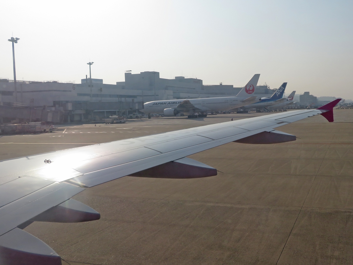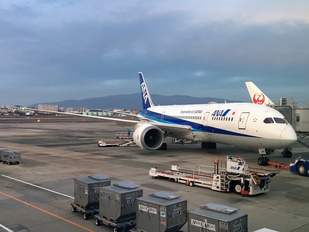 大阪(伊丹)7:30発の東京(羽田)行、ANA14便を利用しました。機材は787-8、JA816Aでした。当日はこの前にもう1便羽田行がありましたが、時間的にちょうどいいこの便を選択しました。787導入からしばらくになりますが、やはり機内の空気の調整が程よく、今回も快適に過ごすことが出来ました。また、窓の日よけも787の特徴で、外が見えながら日を遮ってくれる日よけは、ありがたいものです。