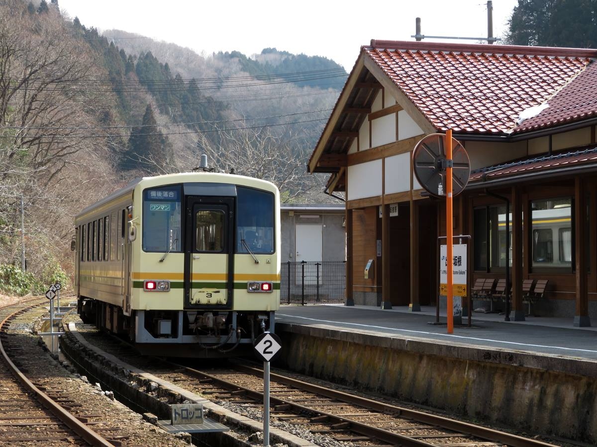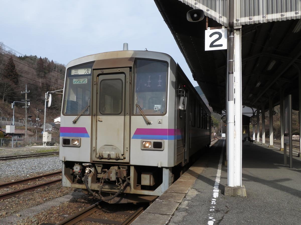 島根県の宍道から広島県北東部の備後落合までを結ぶ木次線。今回はやくも3号から宍道駅で乗り換え、宍道の11:18発の1449Dで備後落合まで利用しました。木次までは全員着席程度の乗車がありましたが、そこからは乗客も減り、出雲横田からはさらに減り、冬のオフシーズンとはいえ、そこから私を含めて旅の方3名で終着の備後落合まで乗車となりました。閑散区間はあるものの、見どころも多く魅力の多い路線で、出雲坂根駅からの二段式スイッチバックや、JR西日本で最も高い標高にある三井野原駅などがその例です。この付近は景色も非常にいい場所ですので、旅行にもいい路線です。