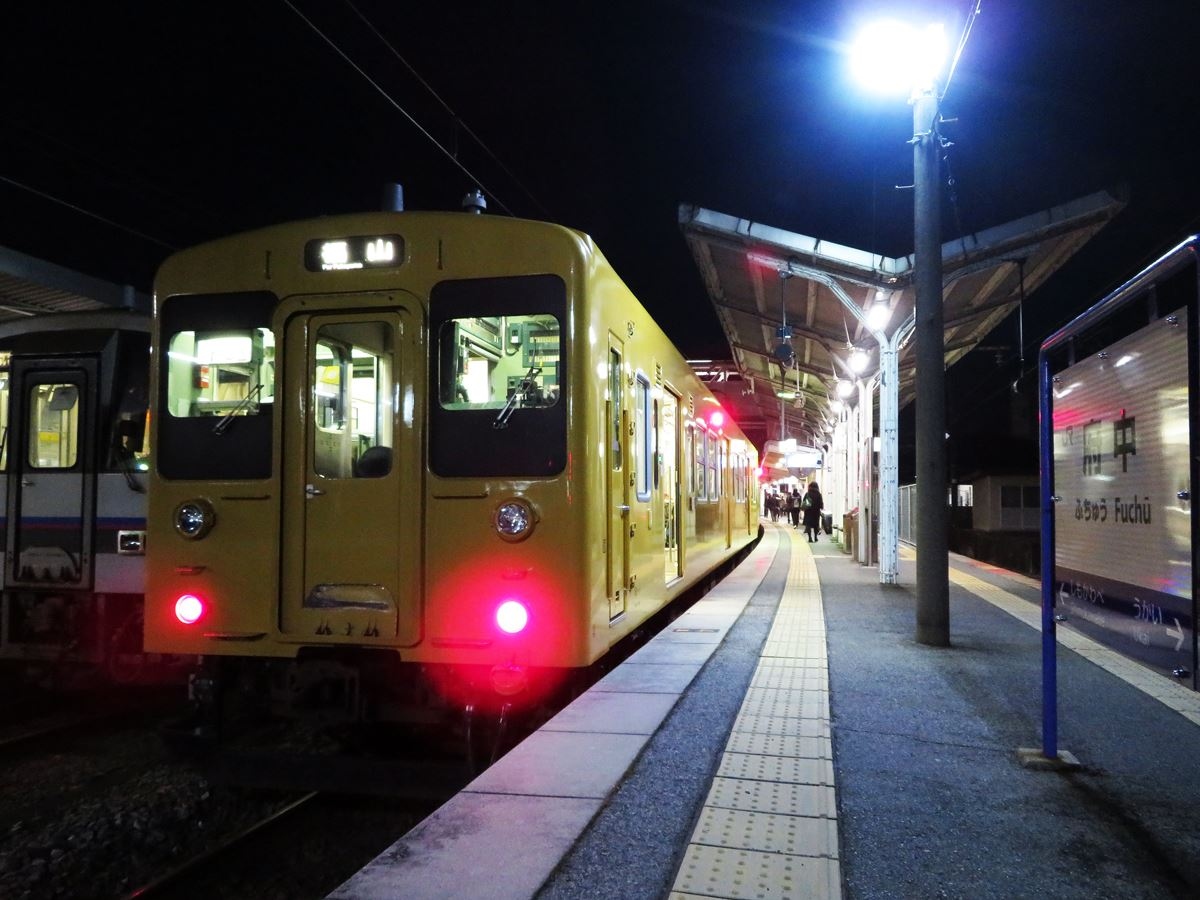 福山駅から三次駅近くの塩町駅までを結ぶ福塩線。今回は、三次16:36発1730Dで府中まで、府中から18:42発270Mで福山まで利用しました。当日は木次線乗車の帰りでしたが、福塩線の列車は三次まで乗り入れており、乗り換え待ちの時間も便利でした。府中までは非電化で気動車1両でしたが、非常に空いていました。府中からは電車となり、広島県第二の都市である福山市への通勤・通学路線の性格もあるだけあって、夜の福山方面でも全員着席程度ではありますが多くの乗車がありました。夜でしたので車窓はあまり楽しめませんでしたが、広島北部から瀬戸内へ抜けるルートとして、旅行の際にも重宝しました。