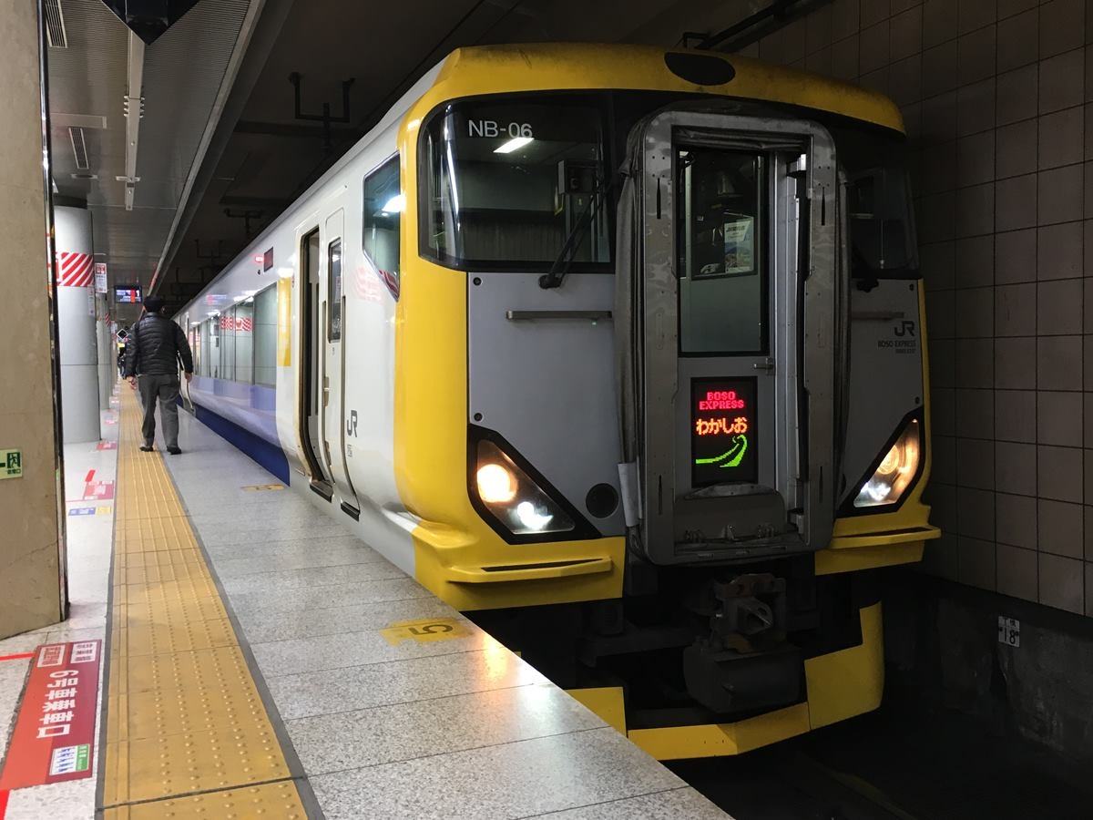 東京駅京葉線ホームから、蘇我・上総一ノ宮を経由して勝浦・安房鴨川を結ぶ特急わかしお。日曜日の下り1号を東京~勝浦間で利用しました。安房鴨川までの移動でしたが、この時間は勝浦までの運転で少し不便さはありますが、終点の勝浦では向かいのホームで数分接続で普通列車があるため、大きな不便さは感じませんでした。東京出発時点で空席は多めでしたが、ゴルフバッグを抱えた方などが途中で降りて行かれました。勝浦到着時には各車両1組程度で、日曜早朝の下りとあってかかなり空席が目立つ列車でした。