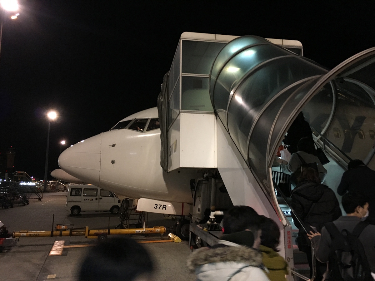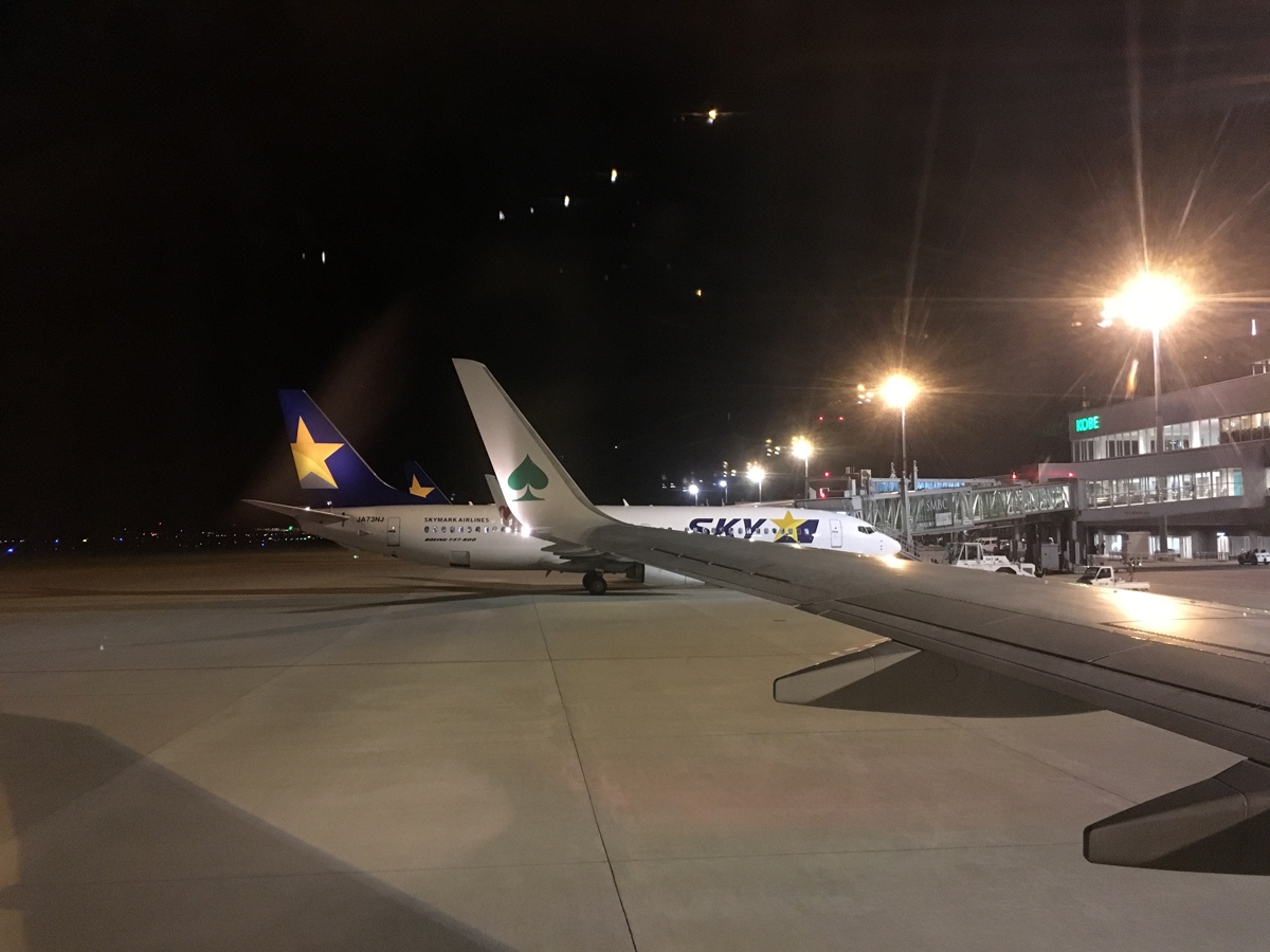 東京(羽田)17:40発、SKY113便、神戸行を利用しました。機材は737-800、JA737Rでした。この便は神戸経由の長崎便でした。使用ゲートは沖留めで、バスでの搭乗でした。LCCが以前に比べて普及した日本において、シートピッチの面で広い上、直前では普通運賃しかない大手とは異なり、直前でも費用がセーブできることがスカイマークの何よりの魅力ではないかと思います。機内ではキットカットを頂き、非常に快適に過ごすことが出来ました。