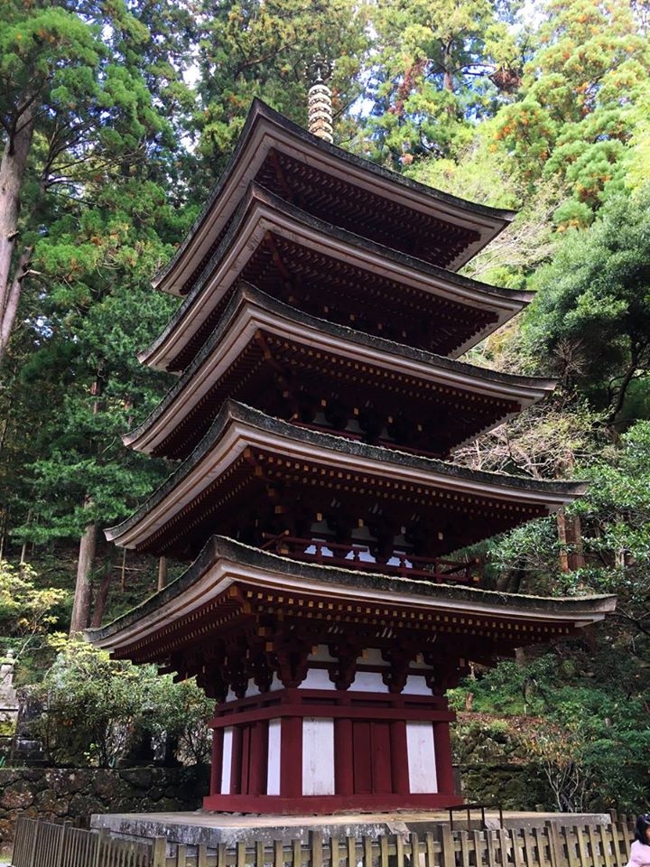 室生寺のシンボルともいえる五重塔で、高校日本史の教科書にも登場するなど、日本を代表する五重塔の一つです。階段状に配置される室生寺のお堂のうち、金堂、灌頂堂(本堂)、五重塔の順に、木々が深い奥に位置しています。(奥の院はさらにその奥に位置)国の文化財指定を受ける木造五重塔の中では最も小さいものですが、朱塗りの塔と周囲の木々の緑がコントラストとなり、非常に美しい場所です。また階段状に配置される、灌頂堂(本堂)と一緒に撮影できる場所もあり、室生寺らしい風景を見ることもできました。
