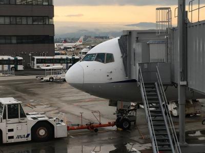 福岡17:30発、大阪(伊丹)行ANA428便に搭乗しました。搭乗機は767-300のJA8674で、機内の内装は国内線の767では新しい方ではありますが、個別スクーリンが装備されたA321には見劣りがします。また767は一部機材でWi-fi利用も可能ですが、搭乗機は利用時はWifi機器の搭載がない機体でした。それでも往路がピーチであったこともあり、少し広い機内で、またいつもの安心感で快適に移動できました。