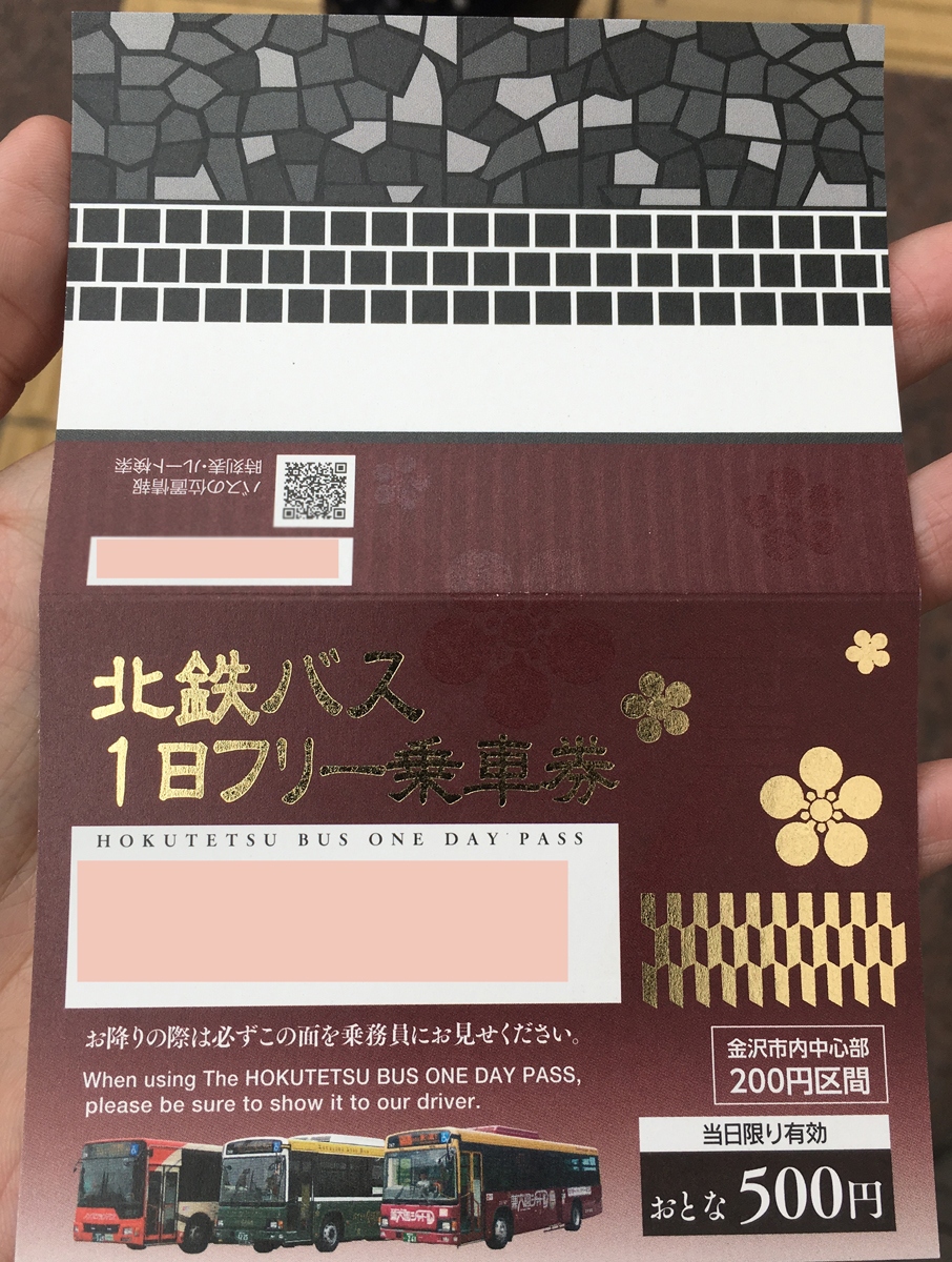 金沢市街地には、主に北陸鉄道バスとJRバスが走っていますが、そのうち北陸鉄道バスは主要な観光地近くのバス停を経路にした、城下まち金沢周遊バスが走っています。系統はいくつかありますが、マップも配布されている上、有名な観光地近くのバス停では車内でのアナウンスでも知らせてくれます。訪問時は金沢駅鼓門近くにあるバス案内所で一日乗車券を購入し利用し、便利でした。