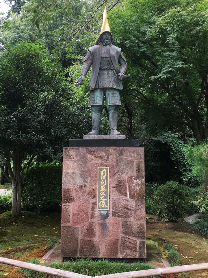 加賀藩の祖で、子孫により加賀百万石ともよばれる発展の礎を築いた前田利家の像が、金沢城の東側、兼六園の入り口の一つである桂坂口の坂の麓から、百万石通りを挟んで金沢城側にあります。像は黄金に輝く鯰尾の兜をかぶっているいかにも金沢らしいものです。金沢を代表する人物の像ですので、金沢の撮影スポットの一つにもなっています。