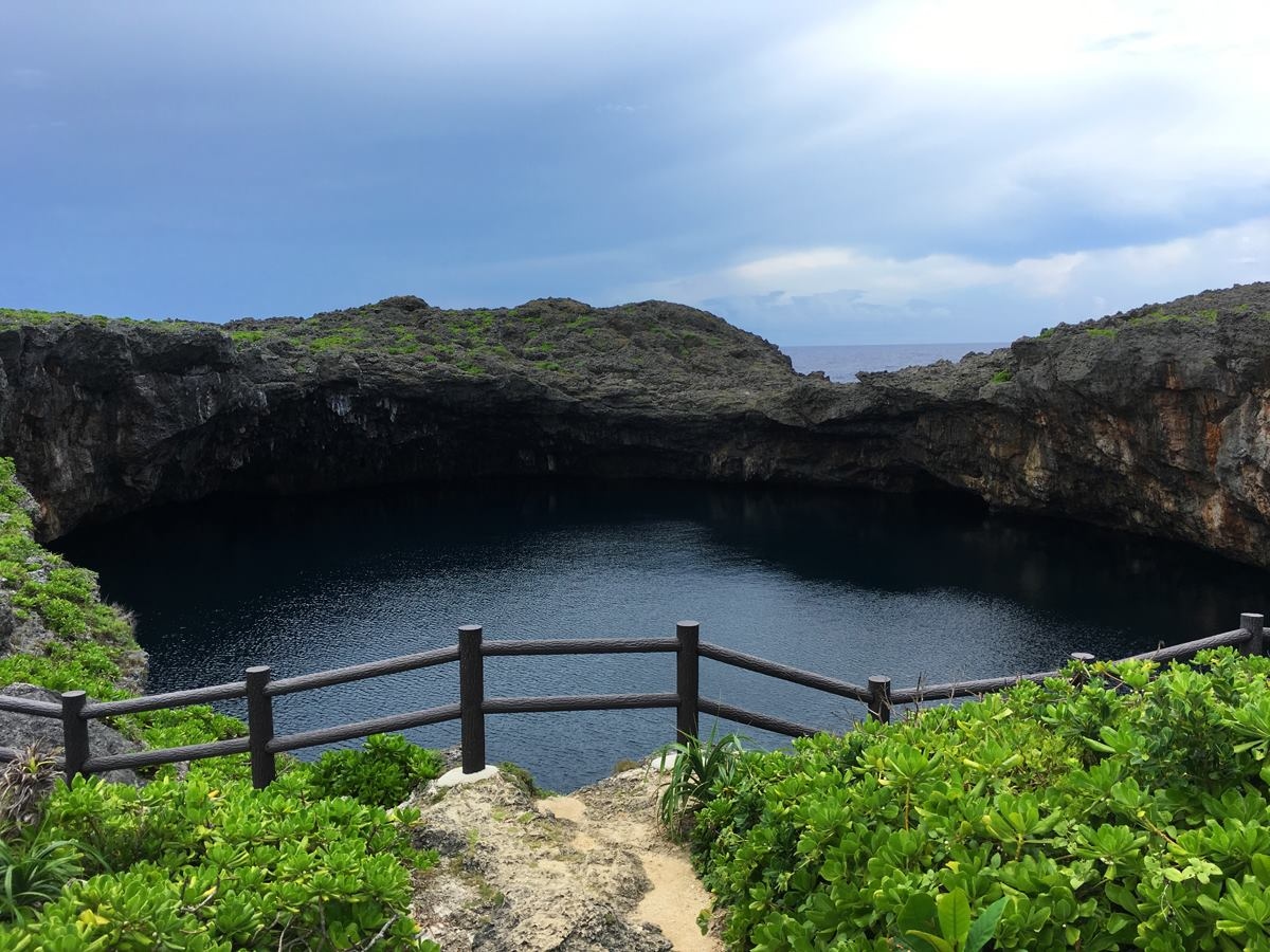 下地島空港の西側に、断崖絶壁にぽっかりと穴をあけた池があります。宮古島から伊良部大橋を渡ってアクセスできる、下地島にあり、国の名勝、天然記念物に指定されています。通り池の手前には駐車場があり、露天のようなお店が出ていることもあります。駐車場からは少し歩きますが、低めの柵越しにではありますが、上から池の様子をのぞき込むことが出来ます。崖にあることもあって、柵は比較的手前に設置されているため、少し見にくい部分は致し方ない部分かと思います。訪問時は風が強い場所でしたので、注意が必要です。