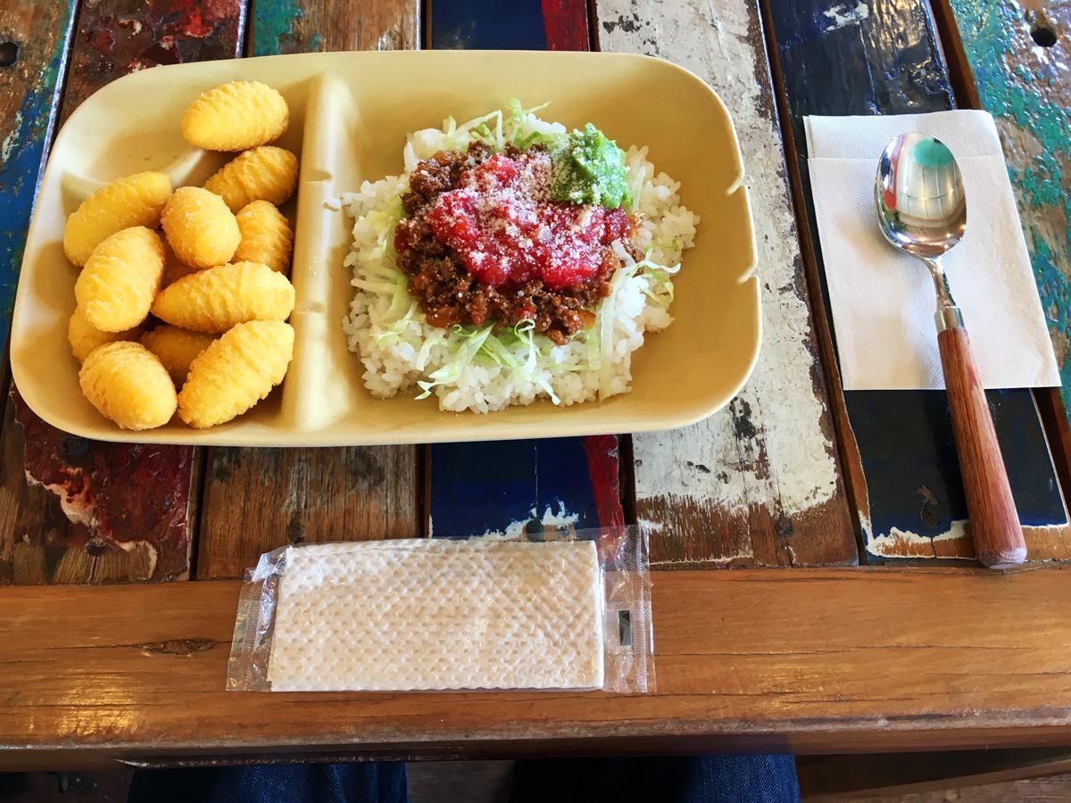宮古島から橋を渡ってアクセスできる来間島にあるカフェ。おしゃれなスムージーや、タコライスプレート、サンドイッチがいただけるお店です。大きなお店ではありませんが、店内に飲食のための席があります。訪問時は夏休み期間のお昼過ぎで、行列が出来るほどではありませんでしたが多くの方で賑わっていました。ただし回転がよくすぐに着席できました。駐車スペースも店舗の前に数台分があります。