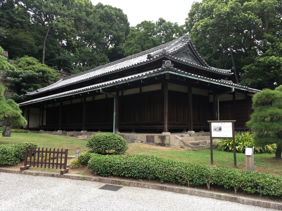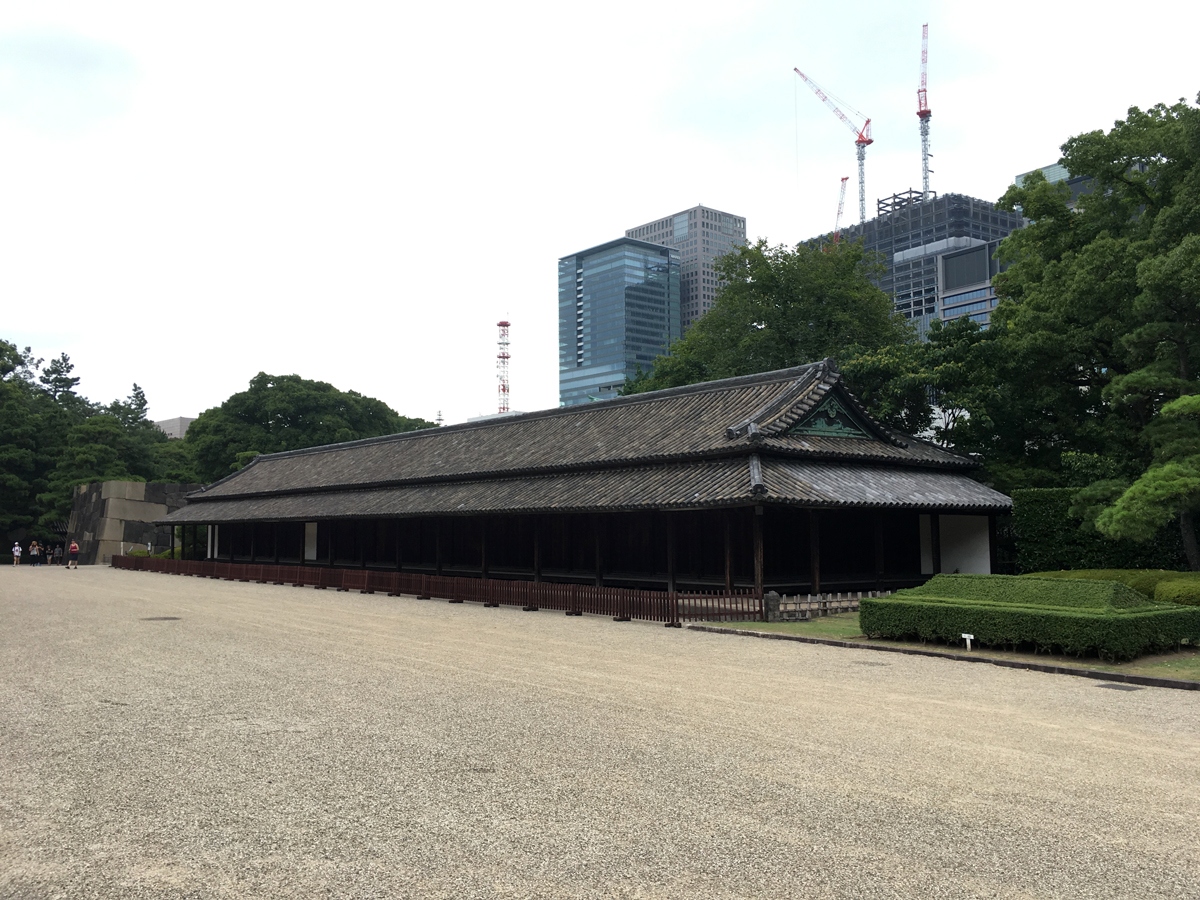 江戸城三の丸から、本丸へ向かう最後の広場にある長い長屋のような建物が百人番所で、名前の通り百人の警備番の詰め所であった場所です。通常内部には入ることができませんが、低いフェンスの手前から建物をゆっくり観察することができます。建物は長屋状とはいえ、長さに驚きます。ほかの番所と合わせて江戸城の守りの上重要であった建物ですので、江戸城では見ておきたい建物の一つです。