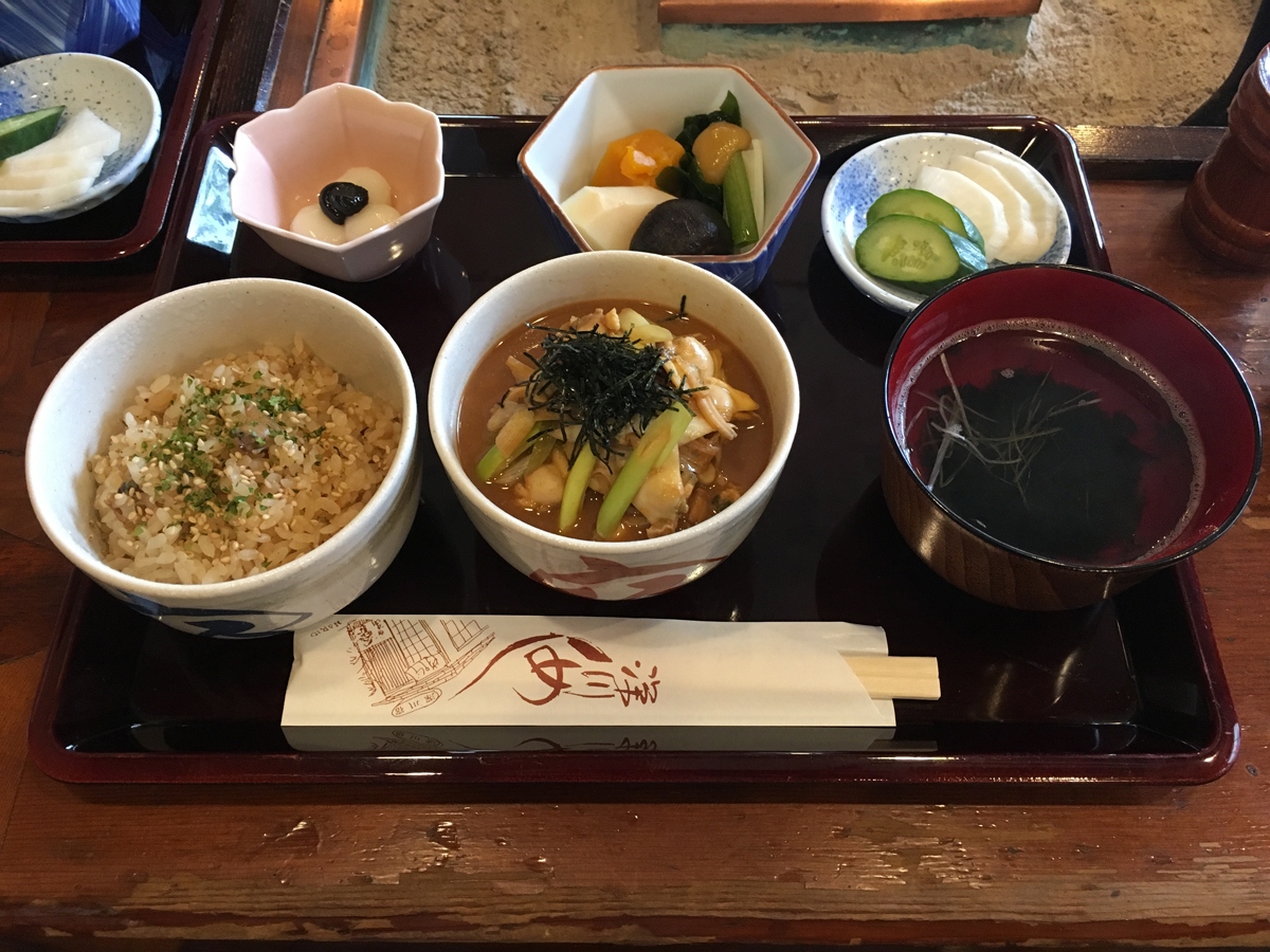 清澄白河駅から徒歩でしばらく、松平定信墓所がある霊巌寺近くにあるお店。店内は小さめで、訪問時も少し待ちましたが、行列が出来るほどではなく比較的早く入ることが出来ました。深川めしは濃いめの味噌で煮込んだアサリを汁とともに熱いご飯にかけたもので、コクがある一品。またアサリの炊き込みご飯も深川めしと呼ぶこともあり、こちらはあさりの風味が広がる一品です。両方がセットになった定食もありますので、どちらも食べたい方におすすめです。また定食には小鉢やデザートも付いていて、お得でした。