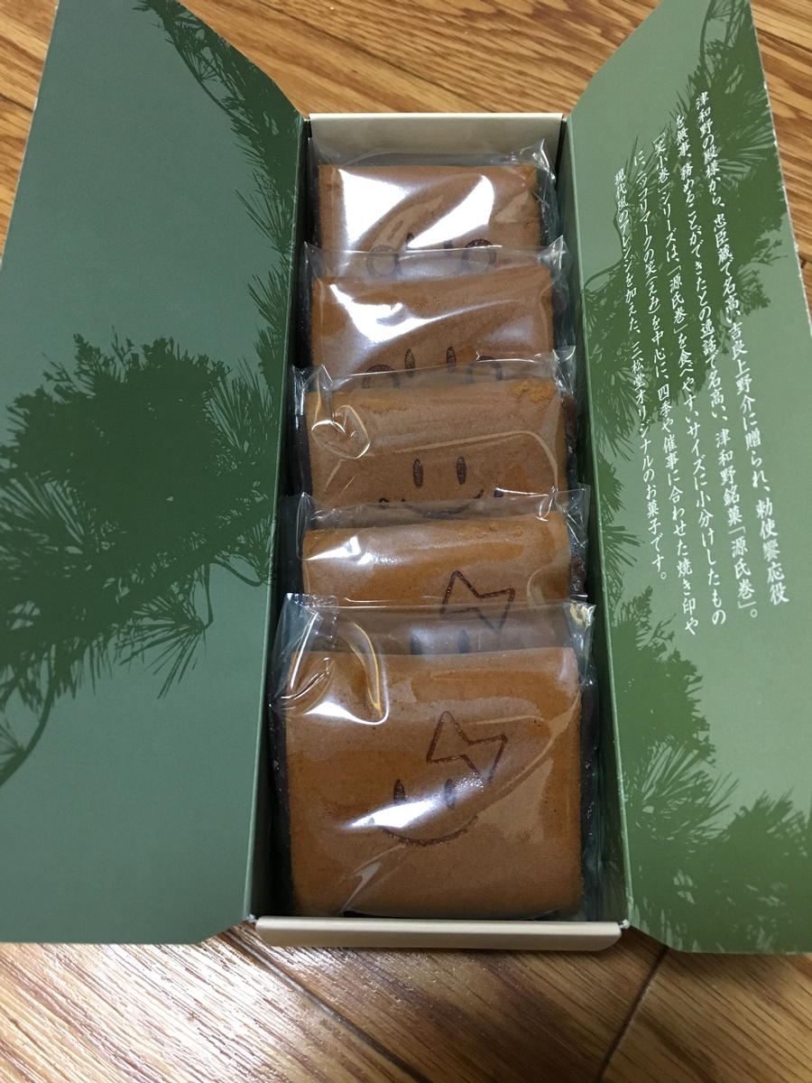 津和野銘菓源氏巻に、かわいい笑顔をつけた笑小巻が買えるお店。笑小巻は季節によって柄も変わるので、どのシーズンにいっても楽しむことができます。程よい甘さのあんこが入ったとてもおいしいお菓子です。そのほかにも魅力的なお菓子が並びますが、訪問時はお茶を出していただき、試食もいただきながら買い物をすることが出来ました。