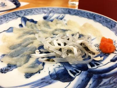 夕食は旅行者のプランで、ふく(ふぐ)づくしをいただきました。てっさ、てっちり、から揚げなどが付き、おいしくいただきましたが、から揚げなどが冷めてしまっていたのが残念です。