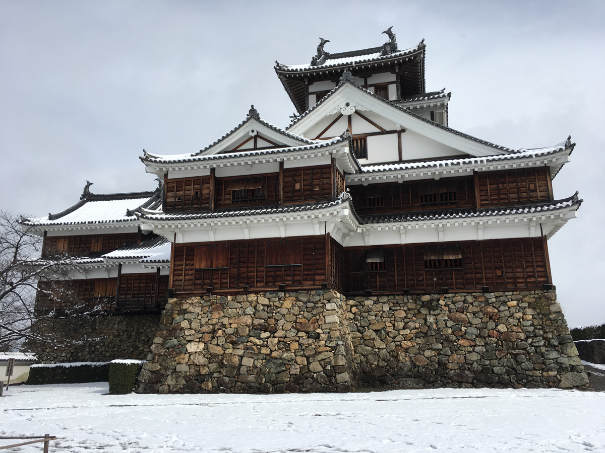 有名な明智光秀が築城した城として知られます。お城は昭和に入ってコンクリートで復元されたものですが、外観復元されており、板張りが大変美しい城となっています。雪景色にも非常によく合う城です。また石垣には五輪塔などの転用石が見られるところも見どころです。