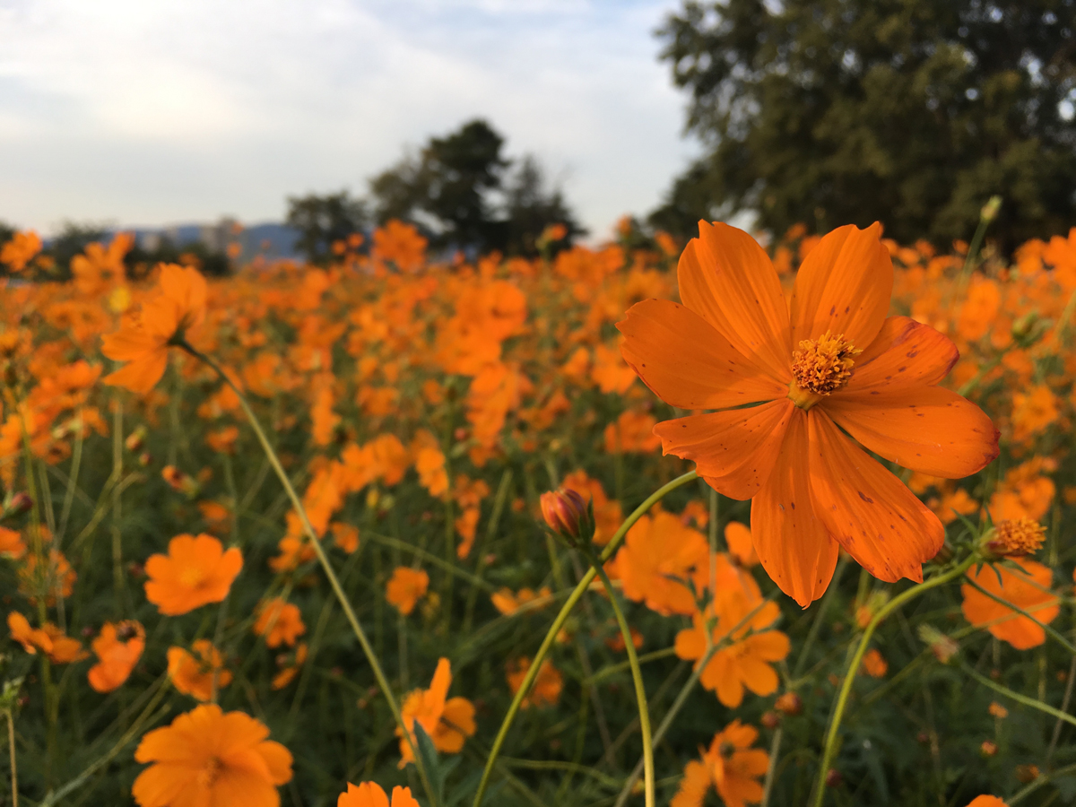 無料で入ることができ、規模も大きいコスモス園です。定番の赤系・白系のコスモスだけでなく、オレンジなども植えられていて、色とりどりのコスモスが広がります。この年は10月下旬が見ごろでした。コスモス畑は周回するように通路がありますので、見る角度によって見え方が大きく変わるコスモスを楽しむことが出来ます。- 旅行時期