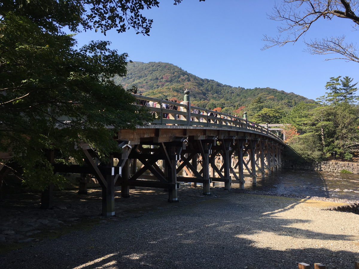 伊勢神宮の内宮を流れる川、五十鈴川にかかる橋宇治橋。一般にはこの橋を渡ると、神域に入ると言われ、橋を渡ると木々が広がる厳かな雰囲気の参道に繋がります。