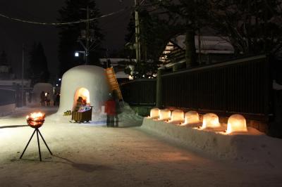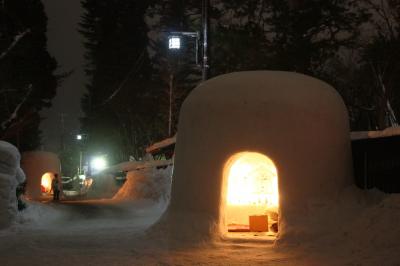 屋根の部分が平らになったその特徴的な形は、かまくら職人なる人達によってるくられたかまくらで、祭り期間中の夜にはかまくらの中に入っておもてなしを受けることができます。