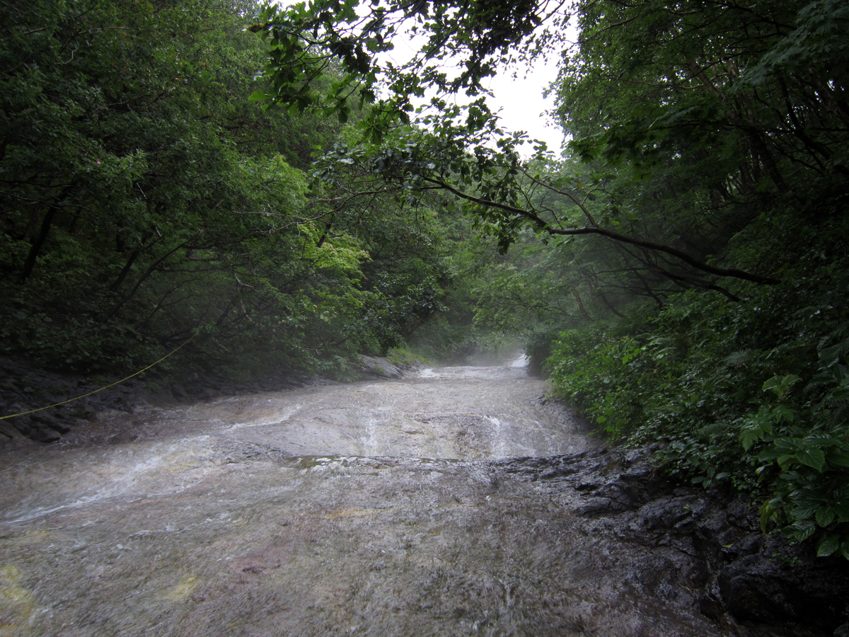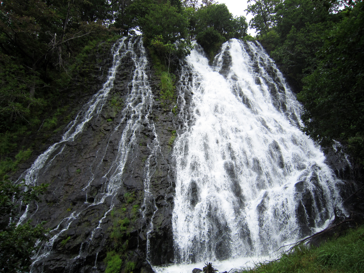 知床五湖からさらに奥にある、温泉が流れる滝であるカムイワッカ湯の滝。酸性分が強いことから苔が生えにくく滑りにくいことから沢登りができます。