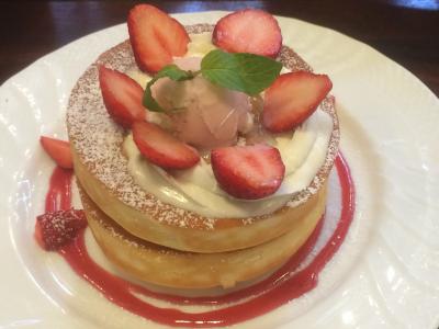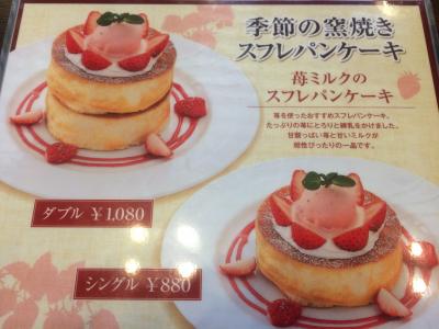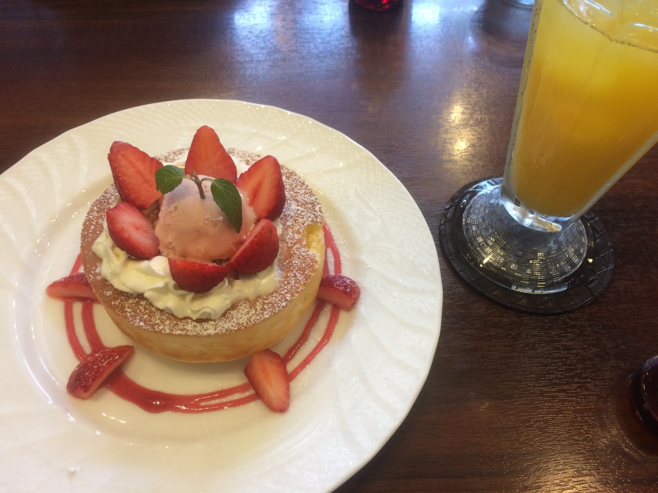 今回は季節限定の苺ミルクのスフレパンケーキを頼みました。