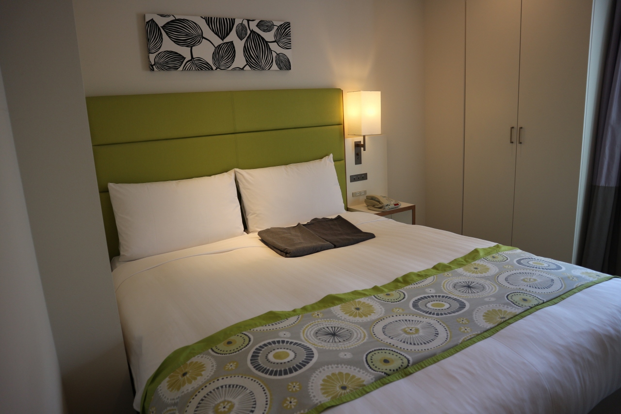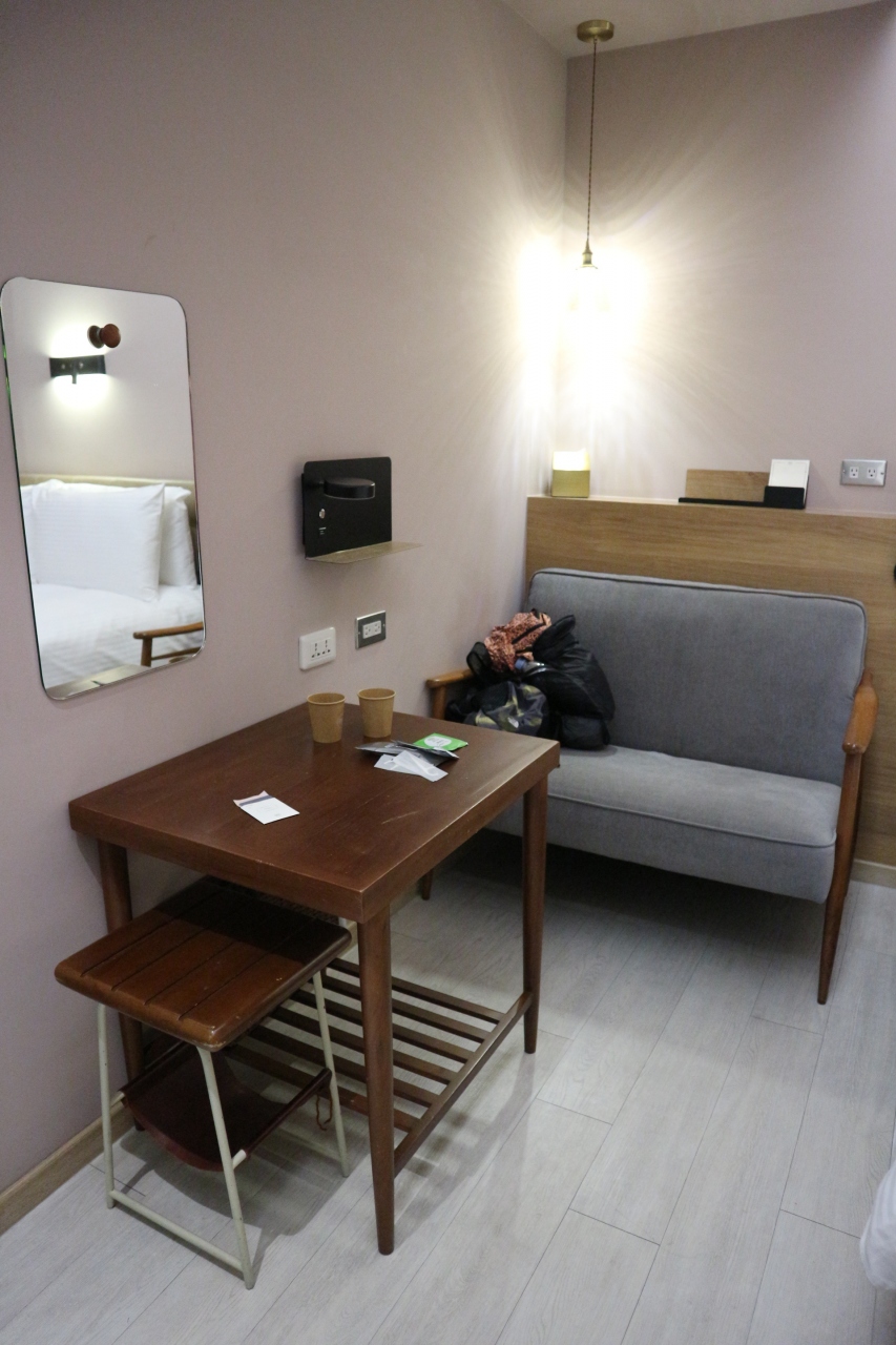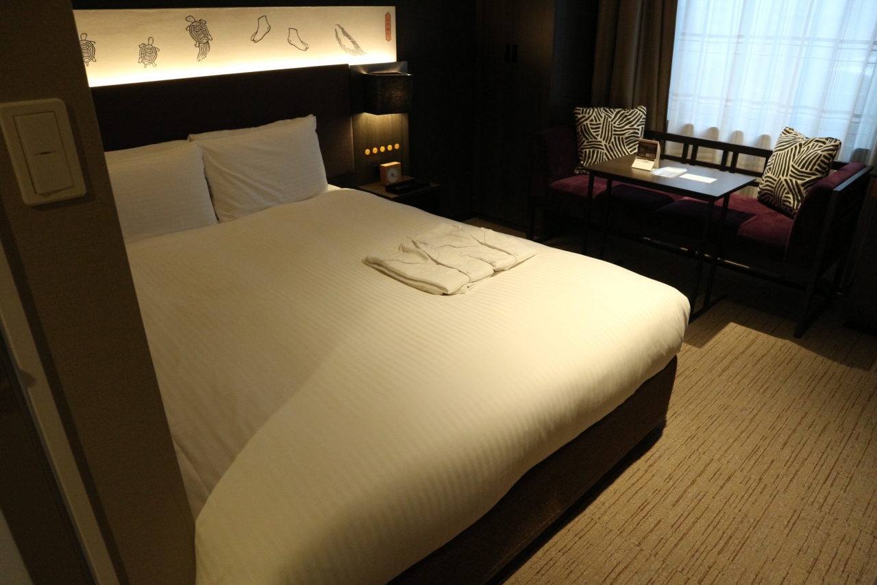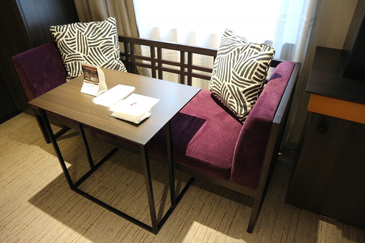 部屋は13階のダブルベッドのお部屋、ソファと椅子、テーブルがあり部屋で寛ぐこともストレスにはならない広さ。シャワーのみですが水回りも綺麗。