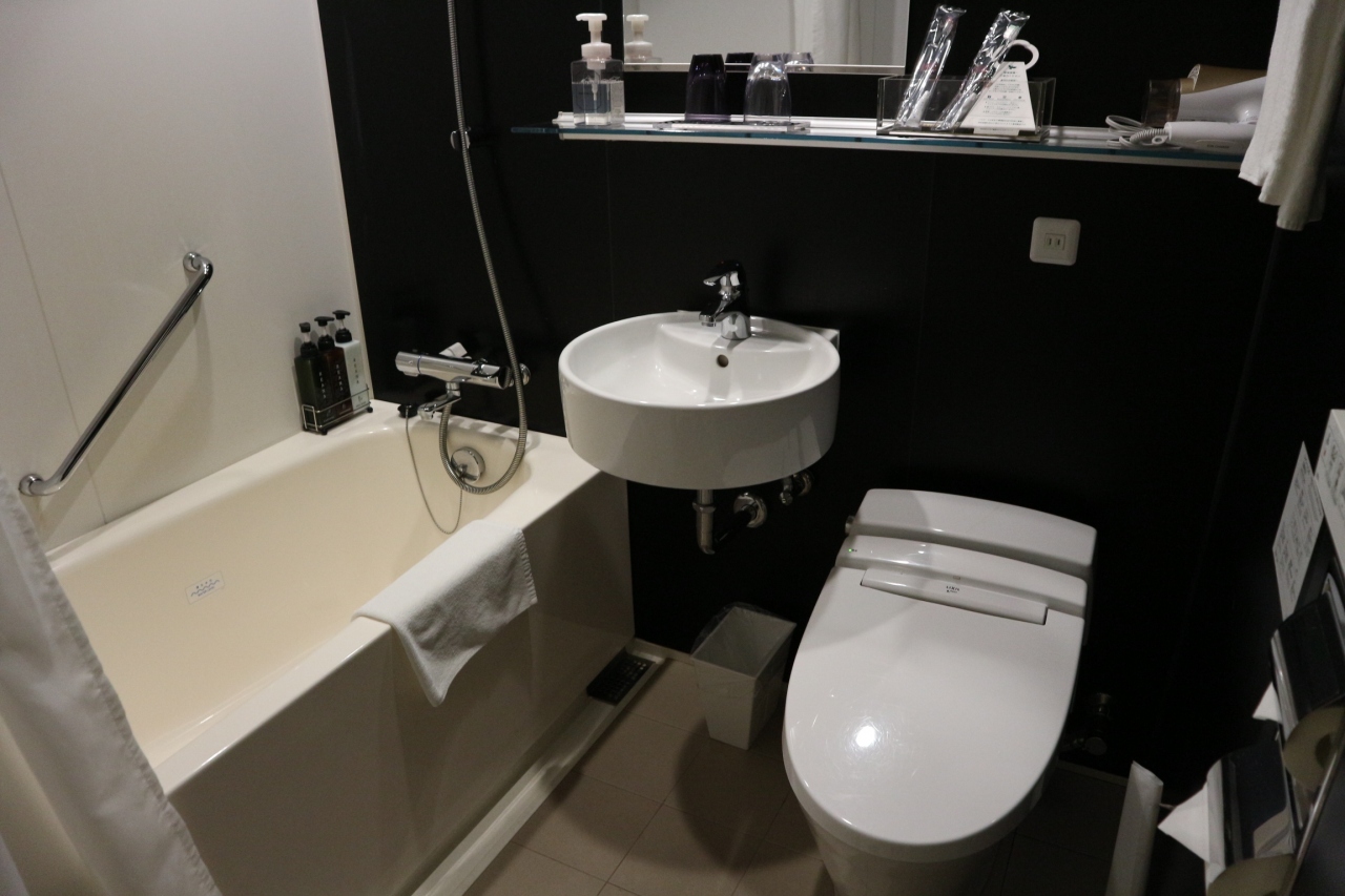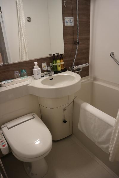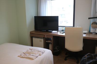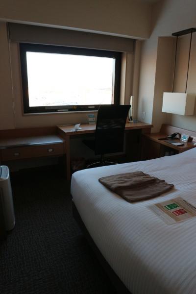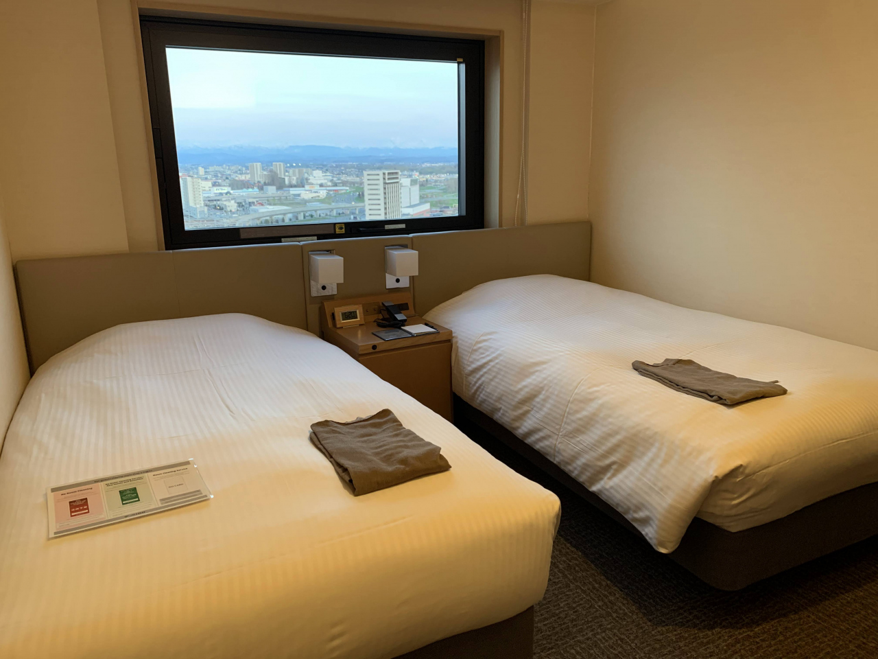 部屋はシンブル。ビジネスホテルなので部屋も水回りもかなり狭く、二人で宿泊しても椅子がないので、ほぼ寝るだけの方向け。禁煙ルームにも小さな窓がありますが、ビルしか見えません。しかし、すすきの中心地に位置し、飲み屋街に挟まれていますが、夜はうるさいと感じることはなかった。