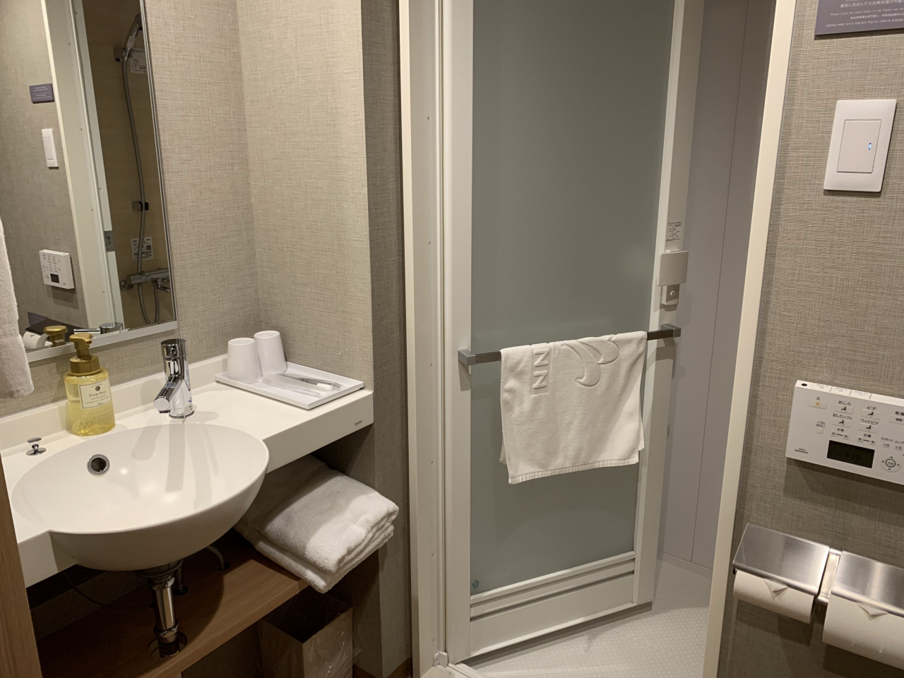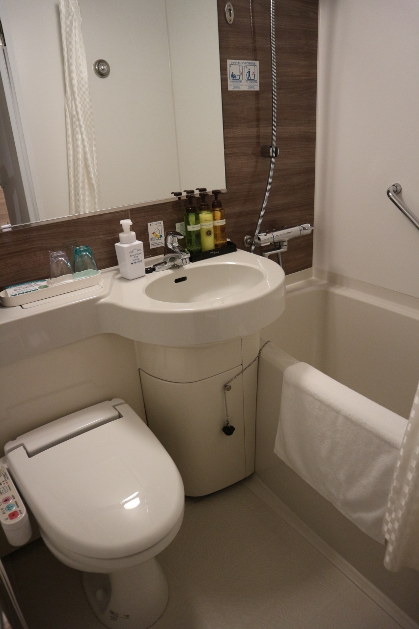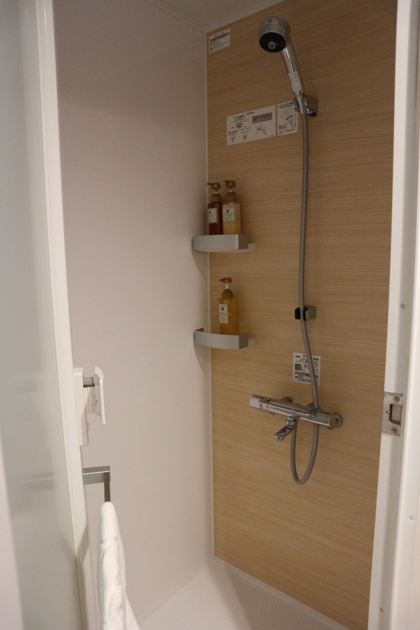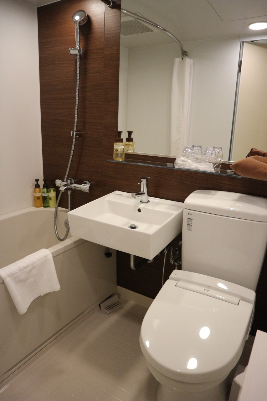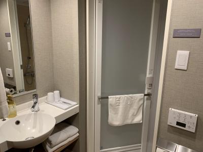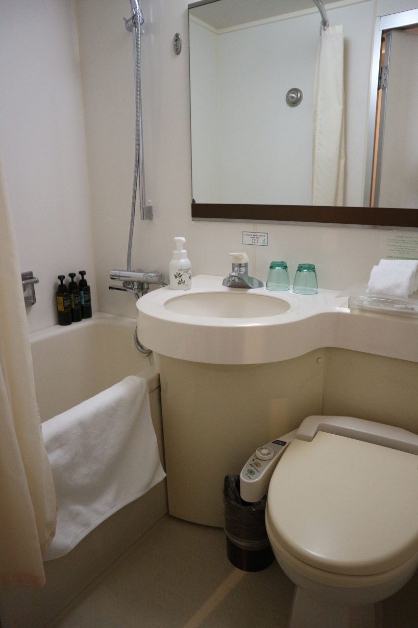 部屋はコンパクト、手洗い場が部屋の中心にあるのがお気に入り。ただし、洗い方によっては水が周りに飛ぶ時があるので床濡れに注意。シャワーのみですが洗うだけなので問題ない。ベッドは高さがありますが、海外のベッドをご存じの方でしたら問題ないと思います。