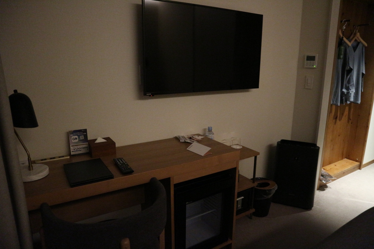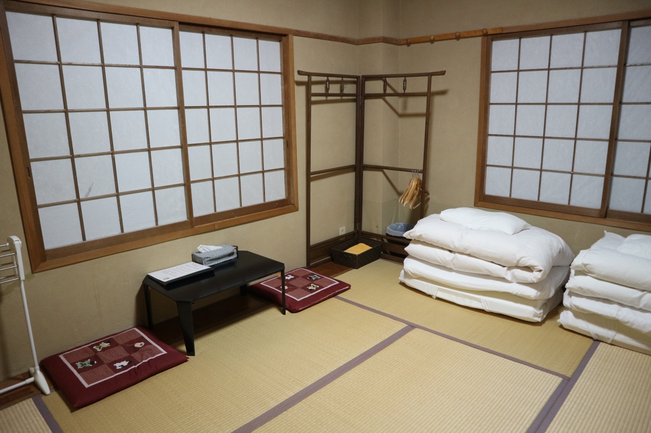 大山登山のために素泊まりで予約。部屋はシンプルな和室、敷布団(セルフで敷く)・テーブル・テレビ。ハンガーや衣類かけが多めにあるのは有難い。