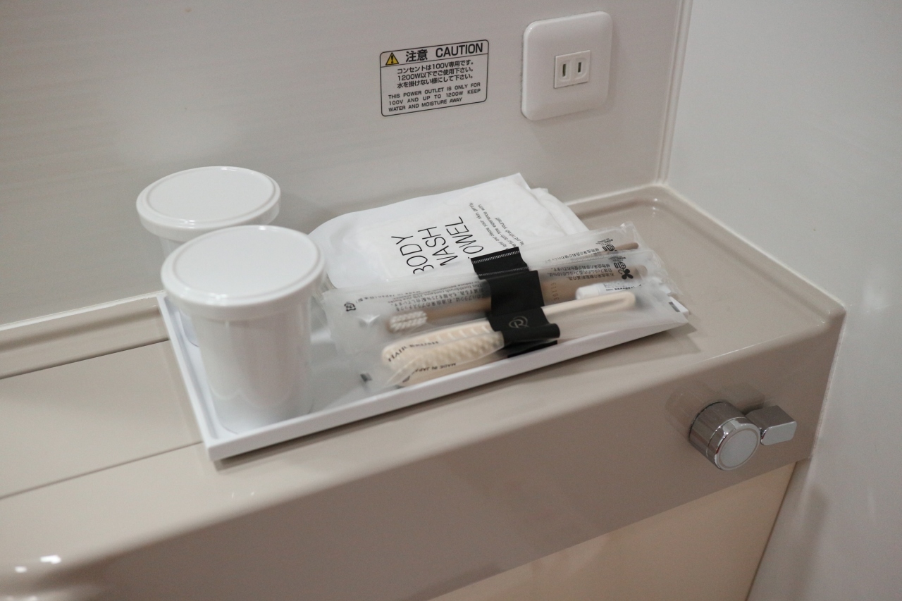部屋は狭いが、窓が開くので窮屈な感じもない。ボディスポンジや化粧水等のアメニティはフロント横にそろっています。歯ブラシは部屋に置いてある。