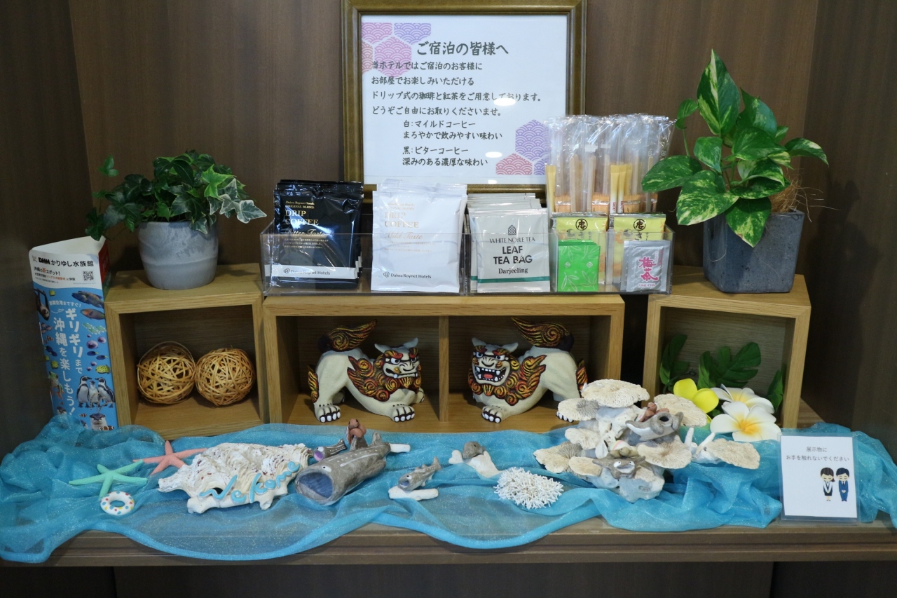 歯ブラシ等の必要なものは、フロント横でピックアップ。1階には24時間コーヒーマシーンもあります。