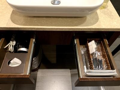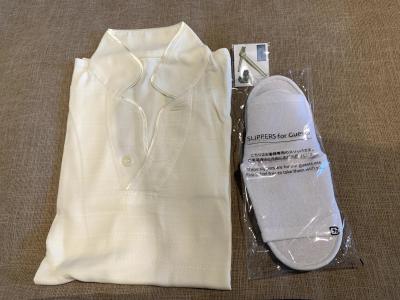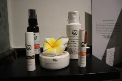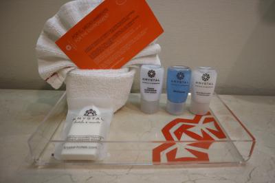 部屋には歯ブラシとボディタオルしか置いてないですが、2階のフロントデスクのフロアにアメニティが置いてあるので、気に入った化粧水やバスソルト等がいただけます。