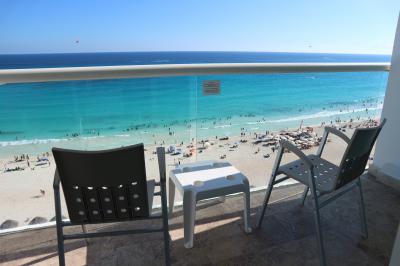 ホテルゾーンの北側にあるクリスタルカンクン。海は目の前で周辺もコンビニ、スーパーマーケットや飲食店がたくさんあります。クチコミではあまりいい評判がなかったですが、私が宿泊したロマンティックルーム・オーシャンフロントの8階の部屋は大満足!