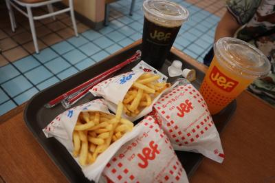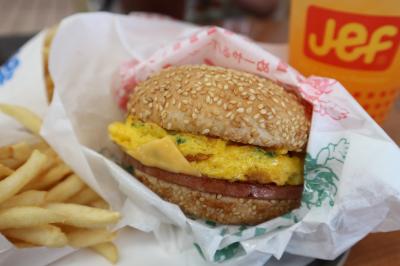 沖縄本島を訪れた際は必ず立ち寄るハンバーガー屋「JEF」ここではゴーヤのぬーやるバーガーがお気に入り。(セット720円)大型店舗で駐車場が広く、観光客も入りやすい。