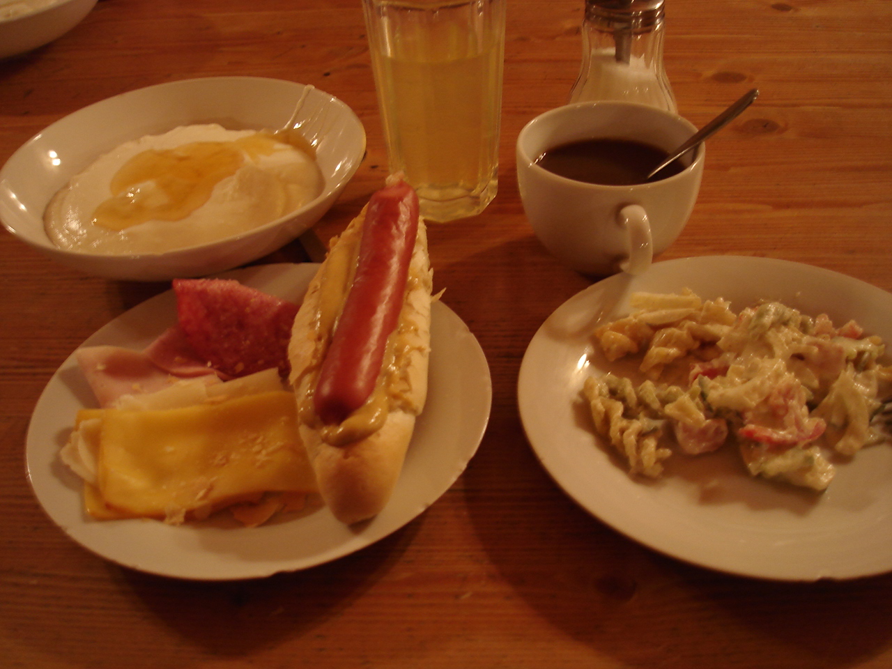ここの一番の良いところは、朝食。写真のように、パン、ハム、ソーセージ、サラダ、コーヒー、ジュースなどなど十分な内容です。