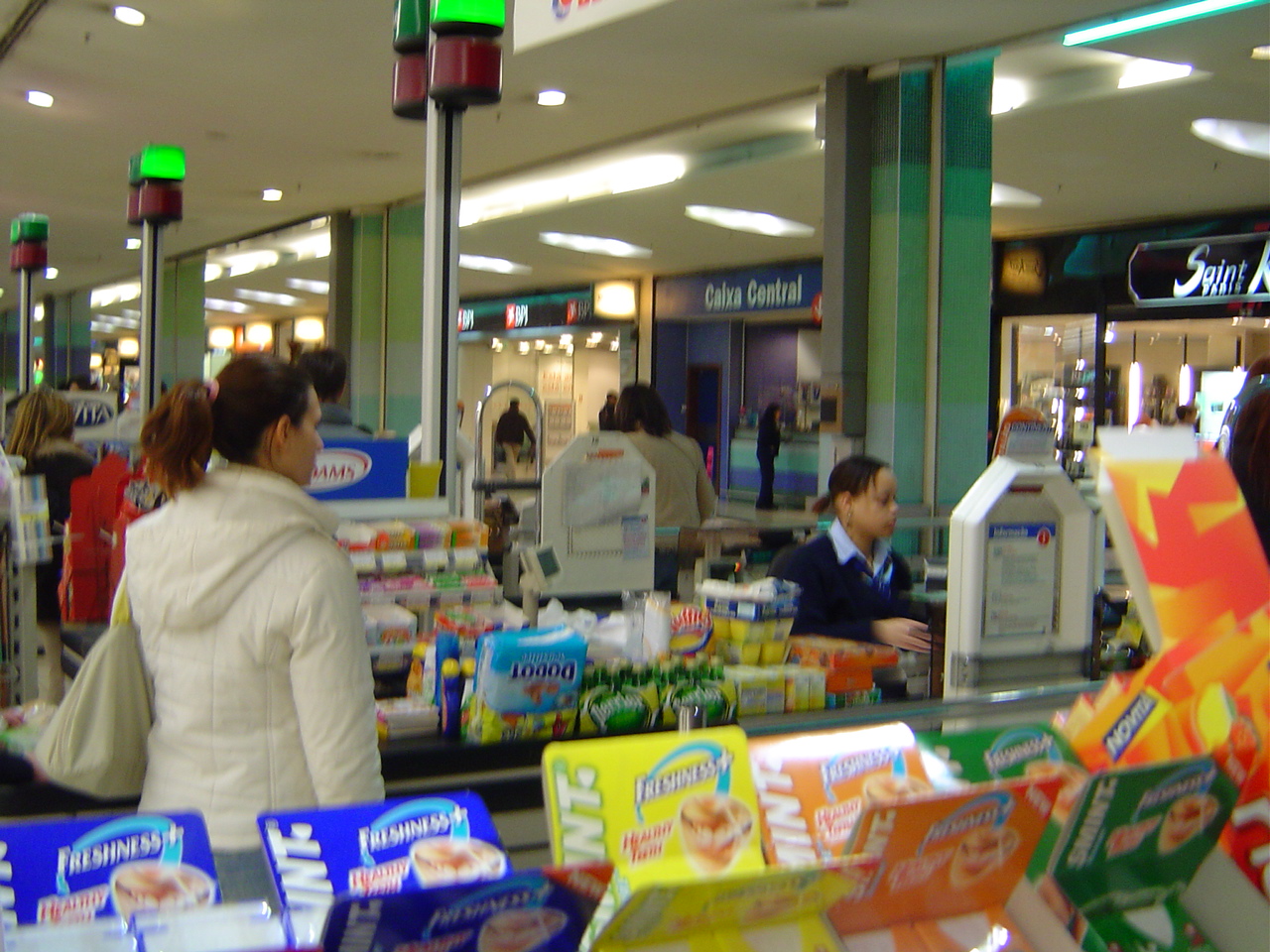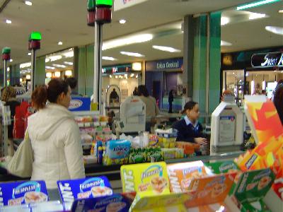 この中にある、”continente”というスーパーがオススメです。デカイ!安い!面白い!の三拍子いや、便利も含めると4拍子揃った巨大スーパーです。フランスが発祥で日本にもある”カルフール”に似た感じですが、ポルトガルらしく豚の足が大量にあったりして、現地の方の生活が垣間見れます。僕のいった夜7時に写真のように大量に購入している方がいました。旅行を安く上げようと思っている方には特にオススメで、フランスパン0.3ユーロ、水1.5?0.13ユーロ、ビール330cc0.2ユーロ、果物は全て量り売りで、バナナ3本とか、みかん2個とかでも買えて、一人旅の時も便利です。僕はここで朝食を用意していました。場所は地下鉄のオリエンテ線(赤線)の終点、オリエンテ駅の改札を出てすぐです。