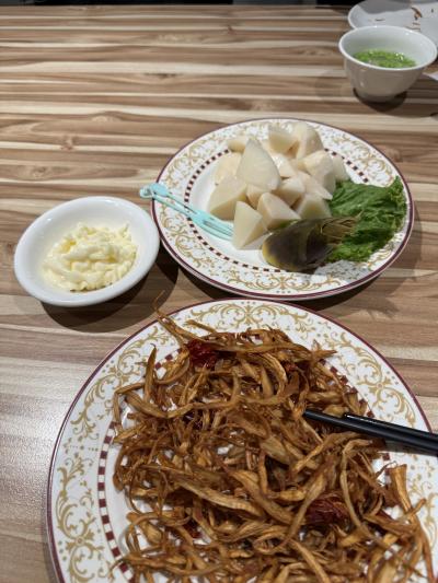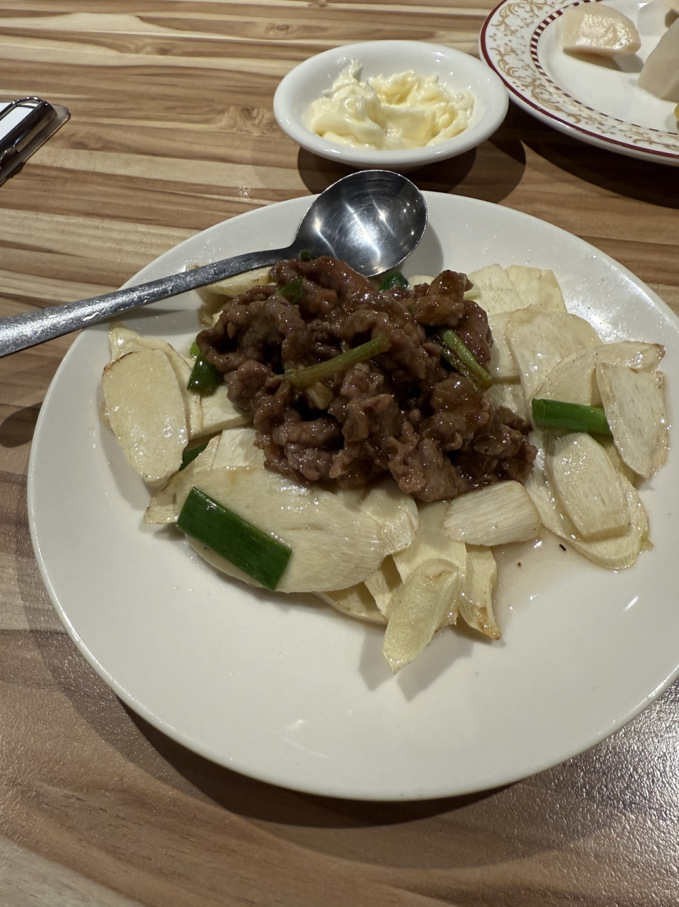たけのこがサラダになったので牛肉とたけのこ炒めは牛肉とまこもだけの炒めに変更になりました。まこもだけは固めの大根のような食感でとてもおいしかったです。