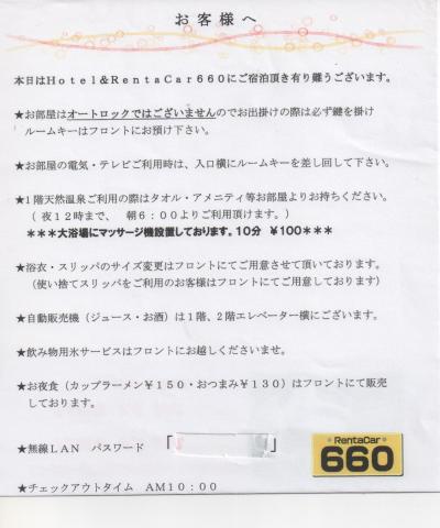 ホテル前の駐車場が満車で、玄関入ったところの案内に沿って3軒隣の居酒屋の駐車場へ。立体交差の横の道路という特殊事情があってか、右側通行+道幅狭い+分離帯の切れ目が狭くて3ナンバーにはちょっと大変でした。出庫時も目の前の道路の交差点に直接出にくく、住宅街を迂回しました。