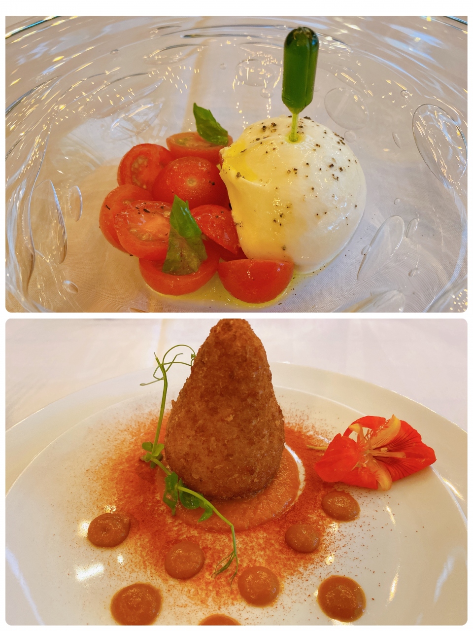 上:カプレーゼ 高級ブラータ生チーズとローカルトマト