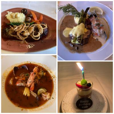 左下 シーフードチョッピーノ:ロブスター・ムール貝・帆立など具だくさん。魚介の旨味を感じるスープです。テーブルでスープを注いで仕上げてくれました。