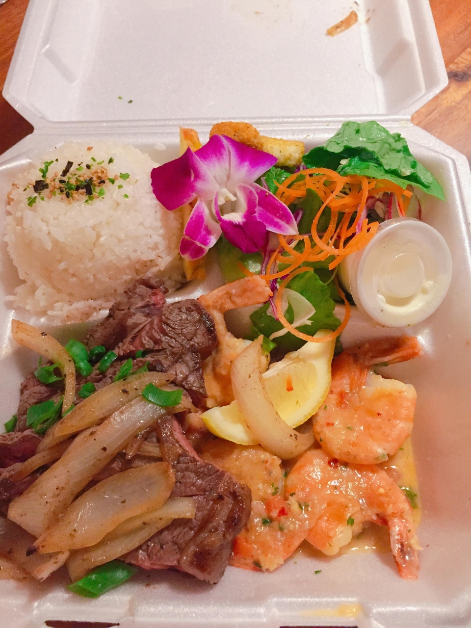 シュリンプとステーキのコンボをオーダー。エビは辛さを3段階で選択することが出来ます。私は辛いのが苦手なのでマイルドを選択。息子はミディアムでも結構辛いと言っていました。エビは大きくてプリプリ。お肉も炭火の香ばしさがありとても美味しかったです。またリピートしたいと思えるお店のです。ただ、テイクアウトにもかかわらずチップを請求されたのは良い気分ではありませんでした。- 旅行時期