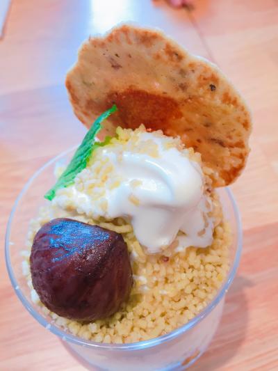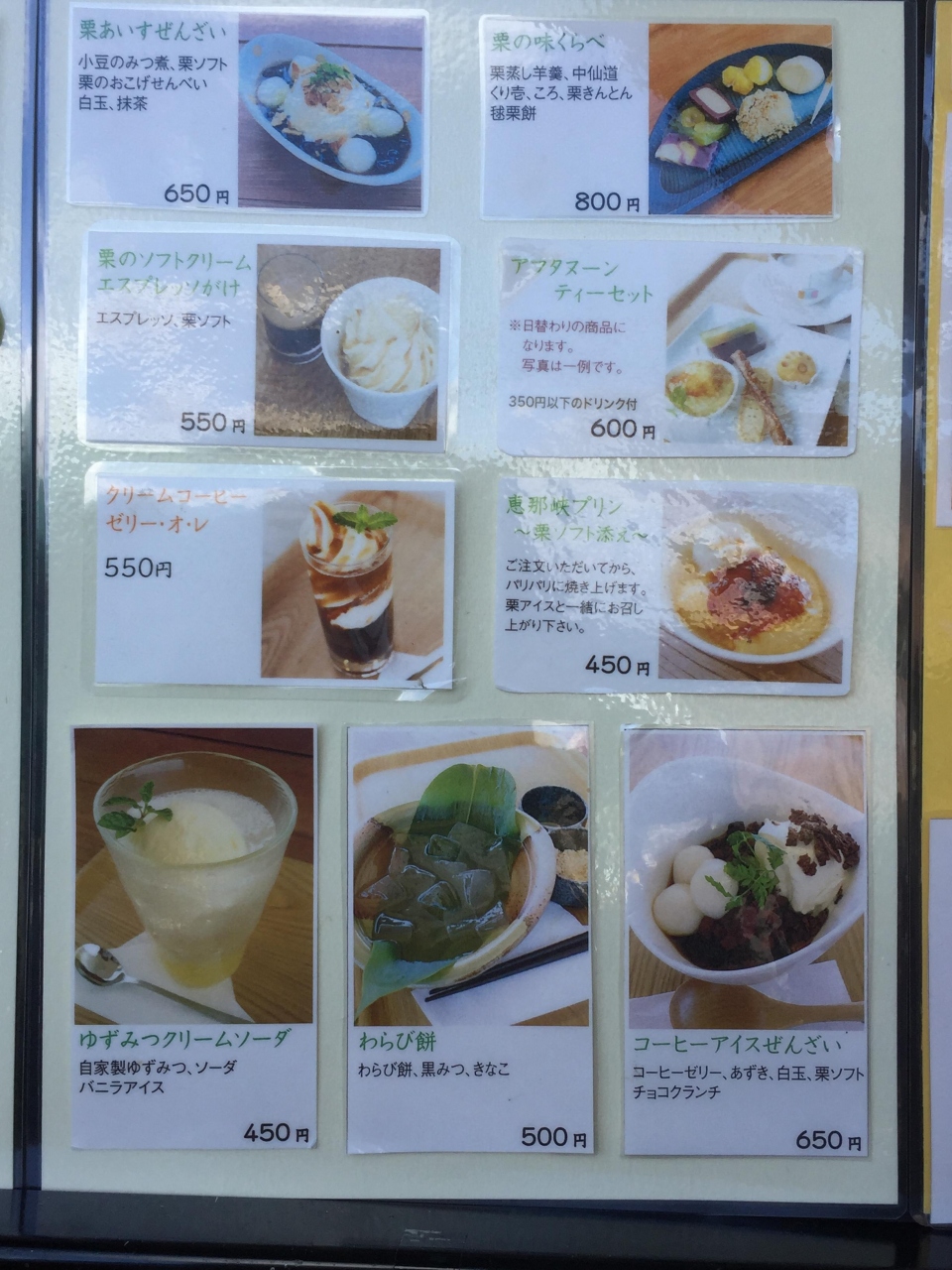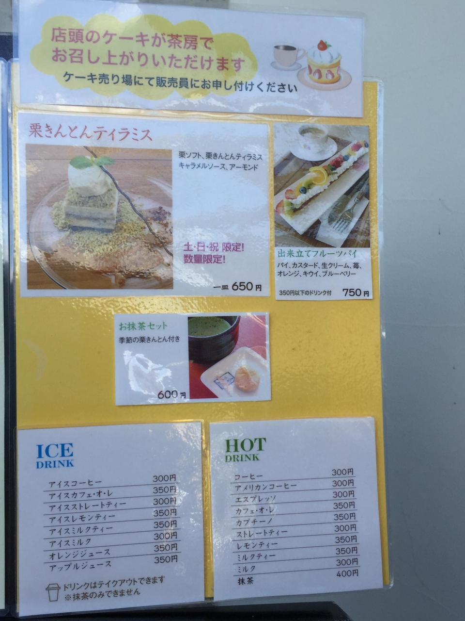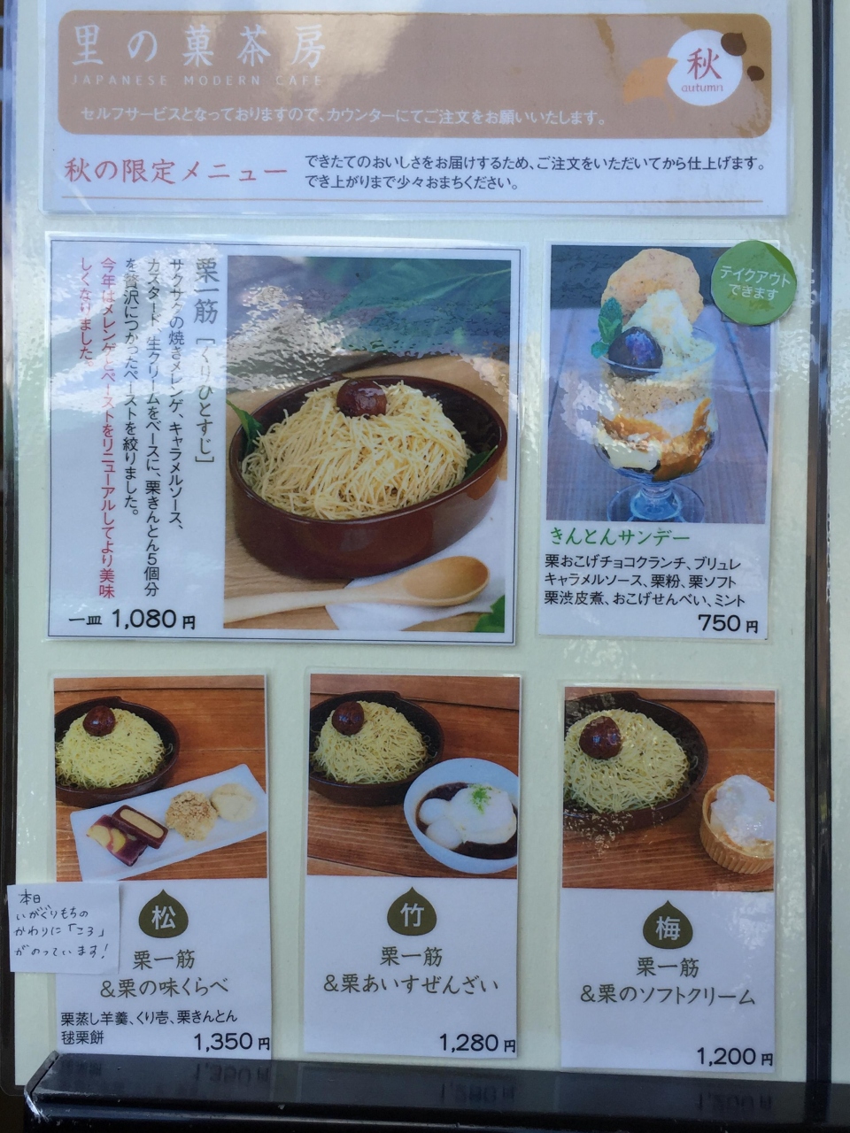 恵那インターから車で10分位。祝日だったせいもあってか、駐車場は満車状態。喫茶コーナーには長蛇の列ができていました。1時間近く待って店内に。栗一筋&栗の味くらべときんとんサンデーを3人でシェア。栗一筋は中心の焼きメレンゲがやや甘めですが、周りの生クリームやカスタードクリームは甘さ控えめ。栗きんとん5個分を使った栗ペーストも甘さ控えめで「栗」を感じることが出来ました。きんとんサンデーも栗粉がたっぷり入っていて「栗」を楽しめます。(緑茶とお水のセルフサービスもありました)
