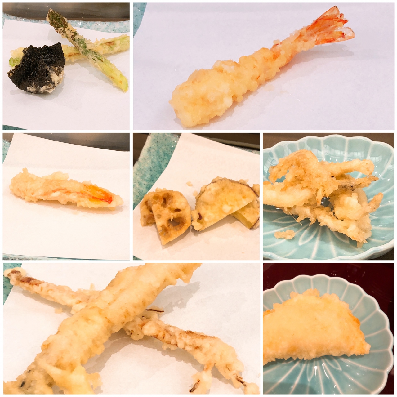 天麩羅は「海老・はぜ・いか・穴子・蟹・玉子・白海老・季節の磯辺・チーズ」から5品。「アスパラ・青唐・蓮根・椎茸・小玉葱・長芋・さつま芋・茄子・みょうが・ヤングコーン・甘露梅・朝鮮人参・アイスクリームの天麩羅」から5品選びます同じ物も可)。板前さんが目の前で揚げてくれるので熱々を頂け、天麩羅を揚げる音も楽しめます。天つゆと5種類のお塩を付けて頂きます。板前さんが穴子にカレー塩で半分・天つゆで半分食べてみてと言われていたので、カレー塩で頂いてみました。カレーの風味はしますがカレーが残らず、穴子以外も美味しかったです。是非お試しください。