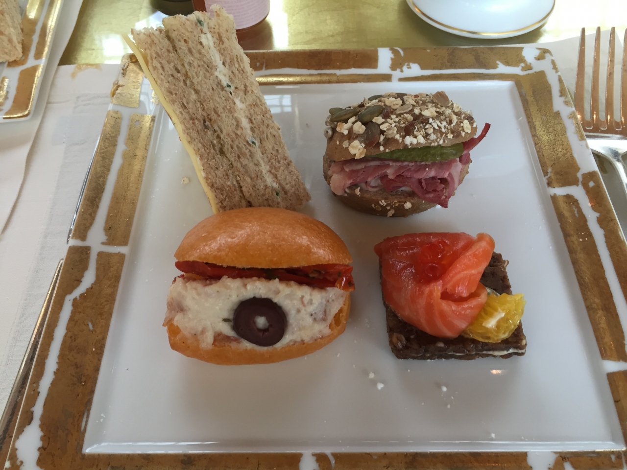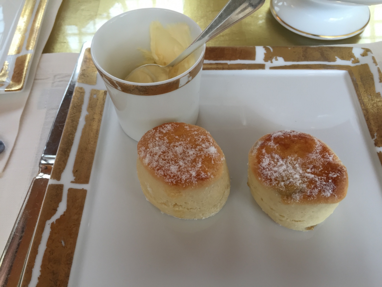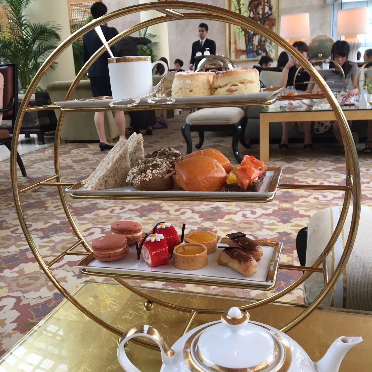 次に運ばれて来た3段トレイ。1段目がスコーン・2段目がサンドイッチ・3段目がマカロンやケーキでした。スコーンとサンドイッチはとても美味しかったですが、ケーキ類は結構甘かったです。