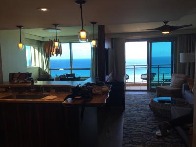部屋は落ち着いた雰囲気ながらも、ワイキキアンと比べると明るい印象です。リビングルームとダイニングルームは、我が家は4人で宿泊したので充分でしたが、定員8人で宿泊するとやや狭さを感じると思います。マスターベッドルームのバスルームからの景色はとても素敵で私の一番好きな景色です。シャワールームが独立しているのは嬉しいですが固定式なので使いづらさを感じました。大きなウオーキングクロゼットがあり、服を掛けたりスーツケースを広げておけるのは嬉しかったです。