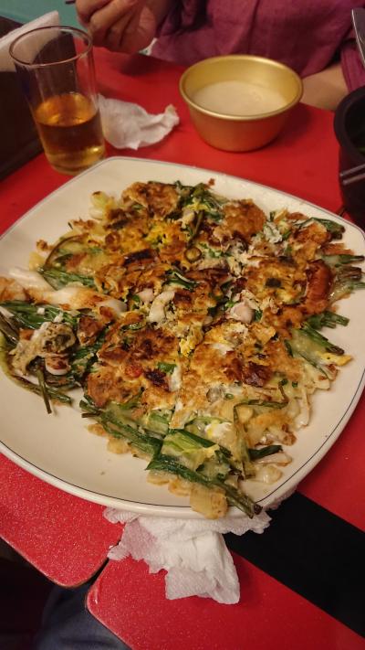 鍾路3街のチヂミ横丁的なお店で食べた海鮮葱ジョン写真のは、ならんでるお...