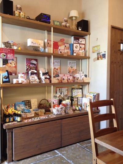 かわいらしいカフェで、店内に入るとうずら商品がたくさん並んでいて、