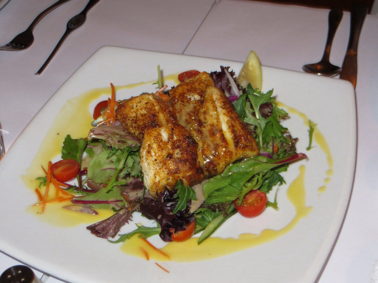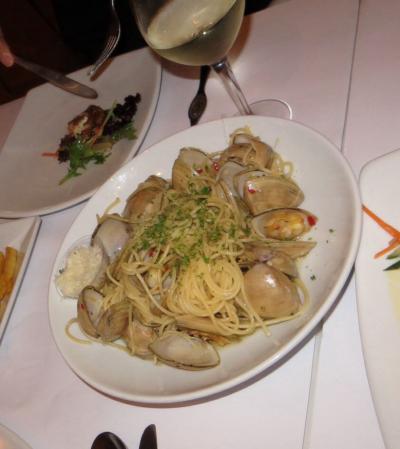 料理は、シーフードミックスグリル、ケイジャン風魚ソテー、ボンゴレスパゲティー、フィッシュ&チップスを4人でシェア。
